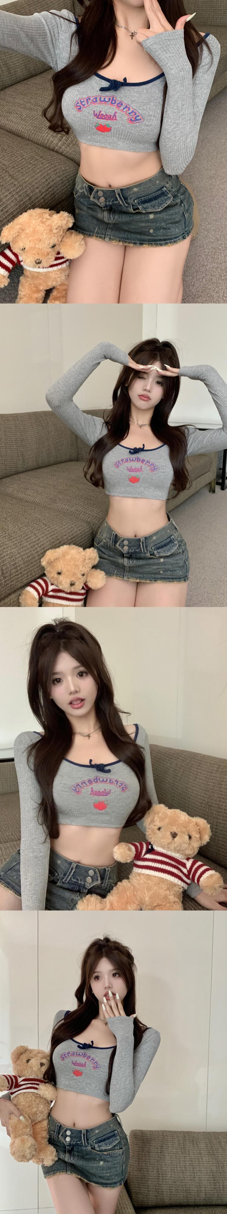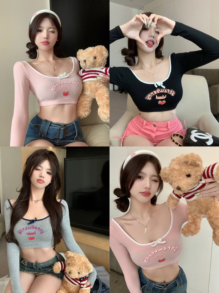 黒のuネックの弓の長袖Tシャツの女性の秋のイチゴのプリントセクシーなスリムショートボトムスシャツトップ ロング ブラック リボン オータム 秋物 bstraw36274074851 | beaute25