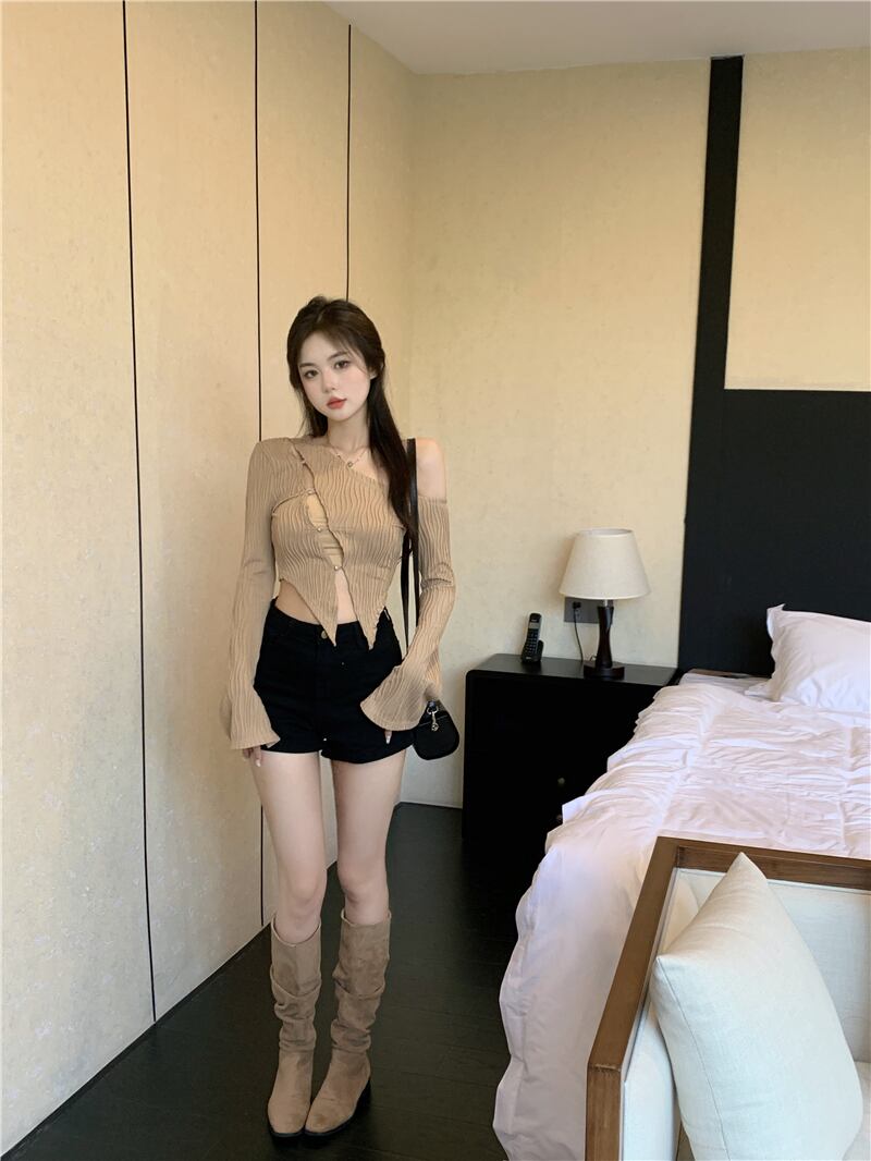 イレギュラーTシャツ レディース 秋 オフショルダー 長袖 甘い 中空 セクシー スリム スリム ショート トップス 2点セット ロング 大人ガーリー スウィート キュート カジュアル オータム 秋物 bstraw25201007556 | beaute25