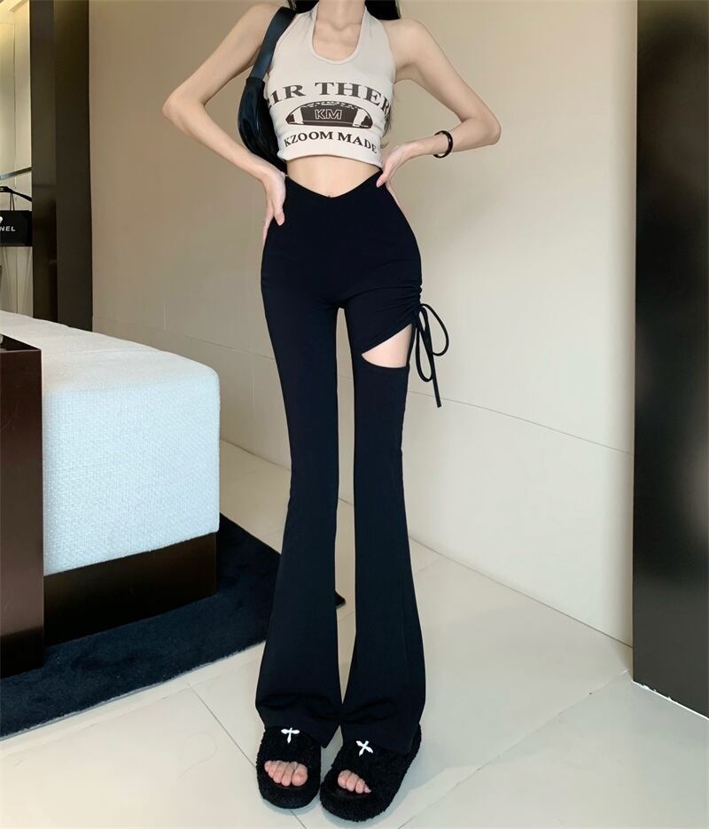 黒巾着中空パンツ女性の夏のウエスト小さな小さな足マイクロ フレア パンツ ズボン ブラック サマー 夏物 bstraw80838301100