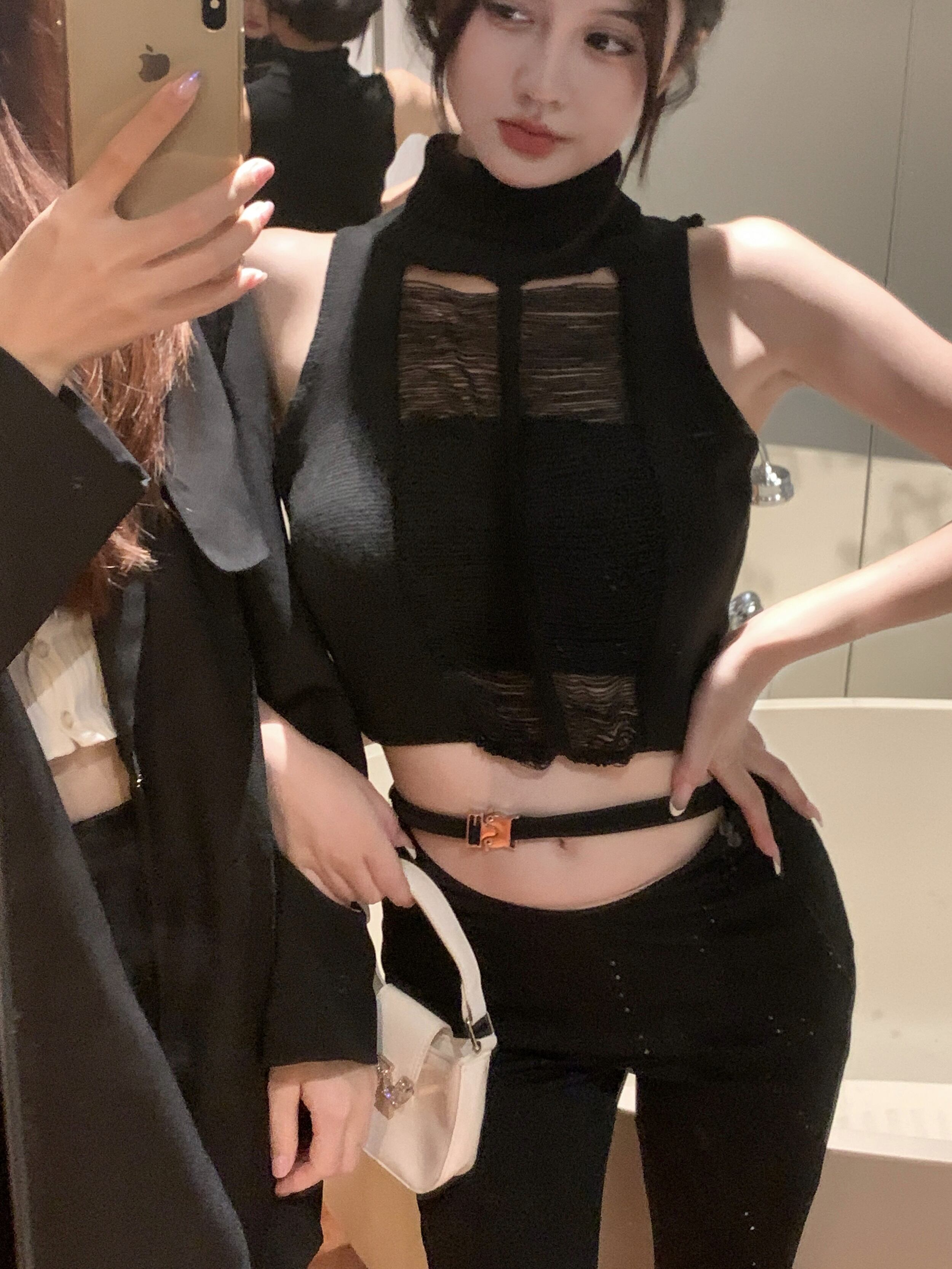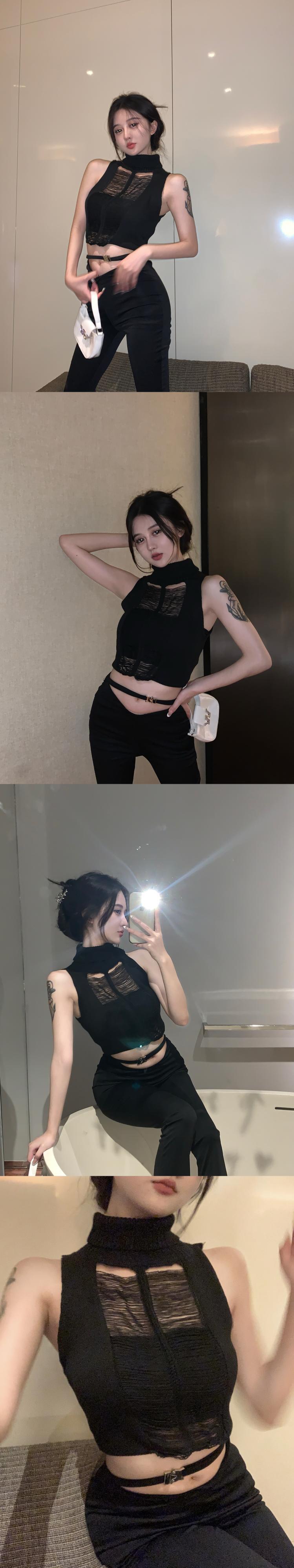 ブラック メッシュ キャミソール レディース 夏 ハーフタートルネック ニット ノースリーブ セクシー 中空 ショートトップ アウター サマー 夏物 bstraw48935406340 | beaute25