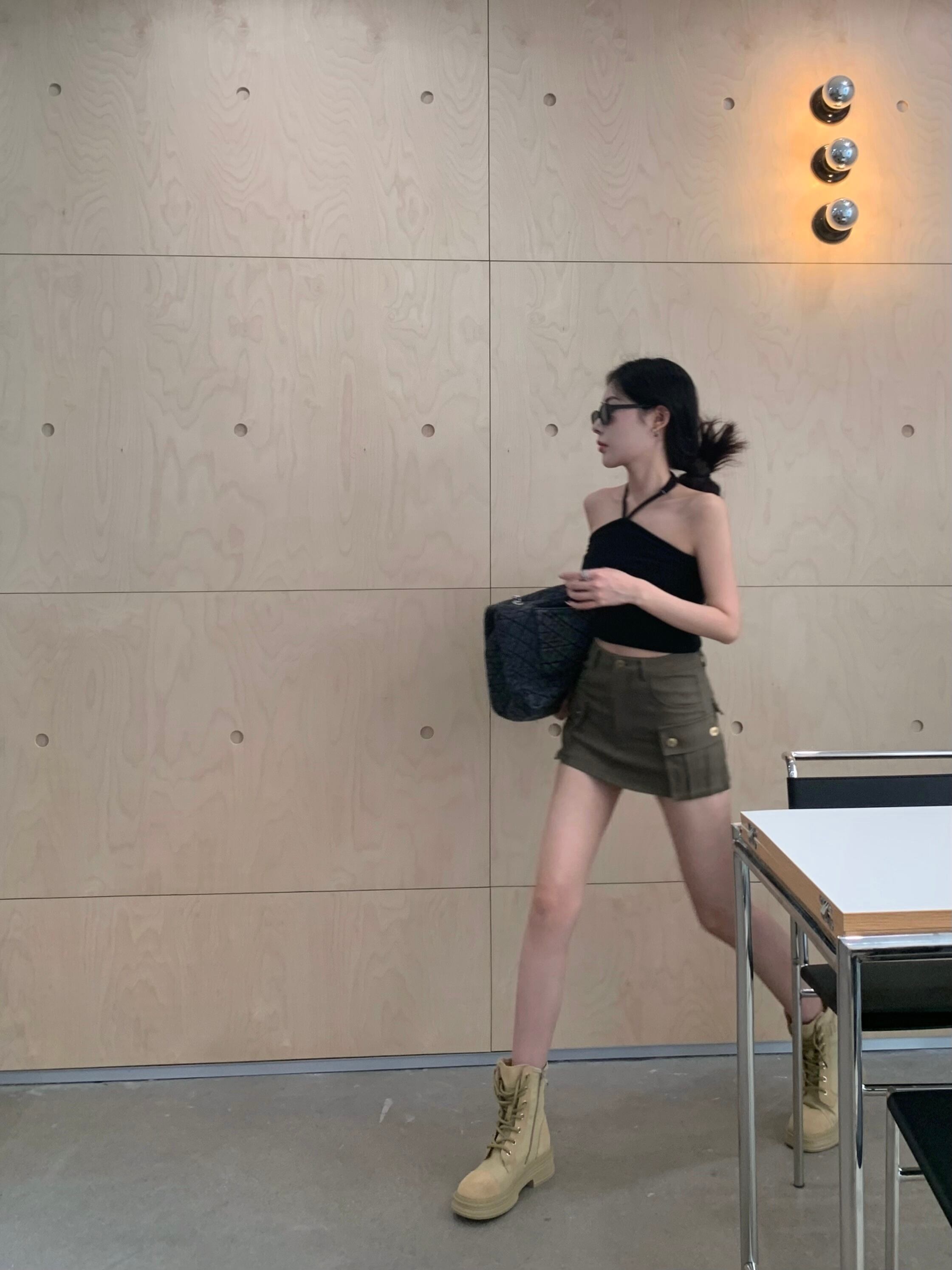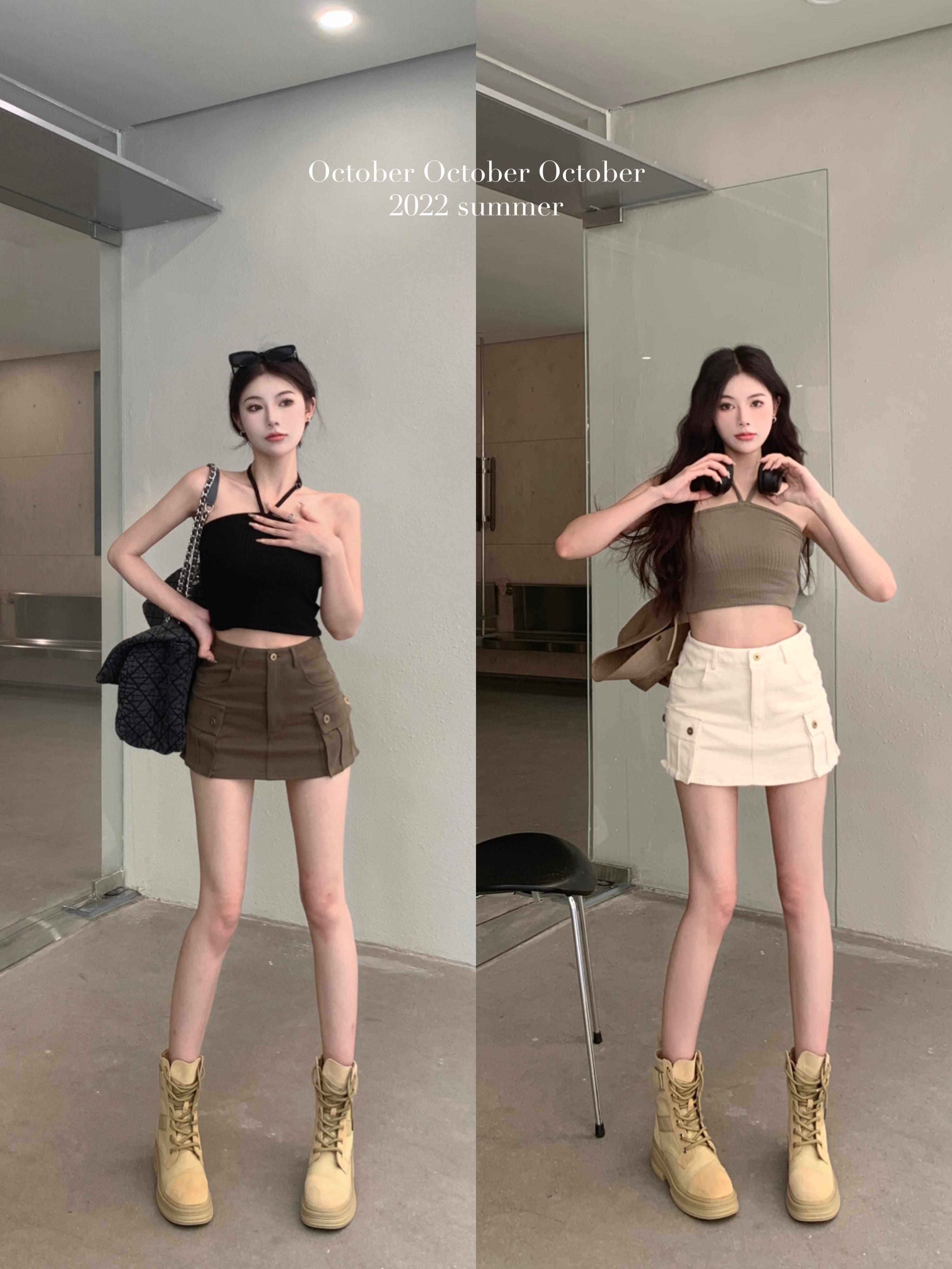 色:ブラックサスペンダー,グリーンスリング,グリーンデニムスカート,アプリコットデニムスカート