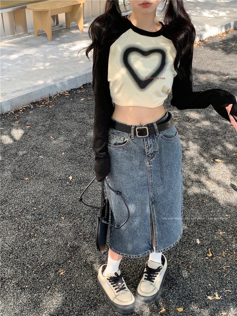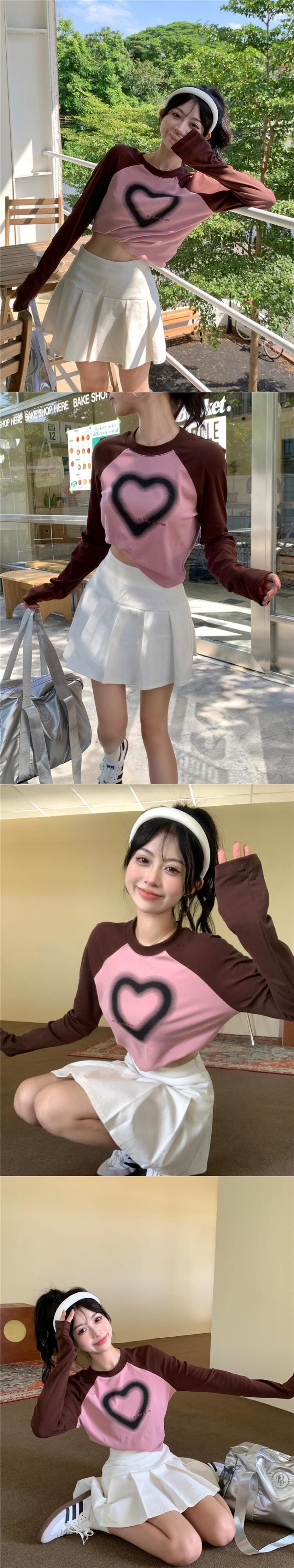 スパイスガールズコントラストカラーステッチ長袖 Tシャツ女性の秋のリトルマンラグランスリーブハートプリントスリムショートトップ ロング オータム 秋物 bstraw33343349027 | beaute25
