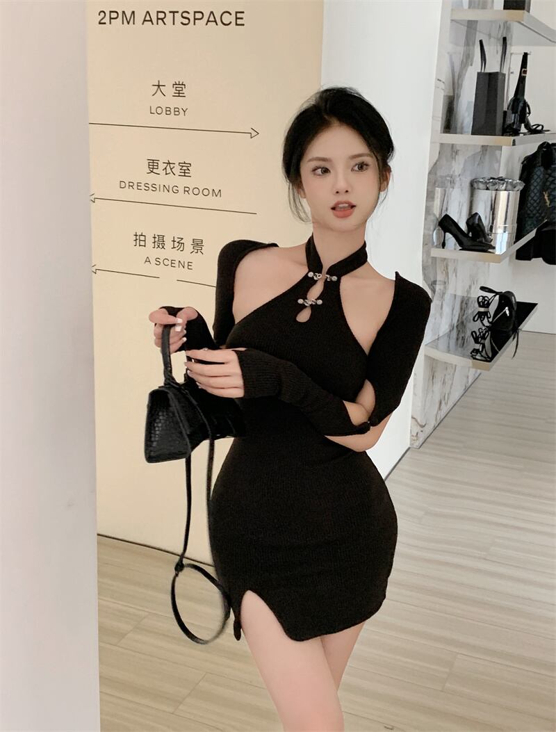 ホット黒改良されたチャイナ ドレス女性の夏のホルター ネック オープン バック分割セクシーなシックなショート スカート パッケージ ヒップ スカート ブラック サマー 夏物 bstraw98896566818 | beaute25