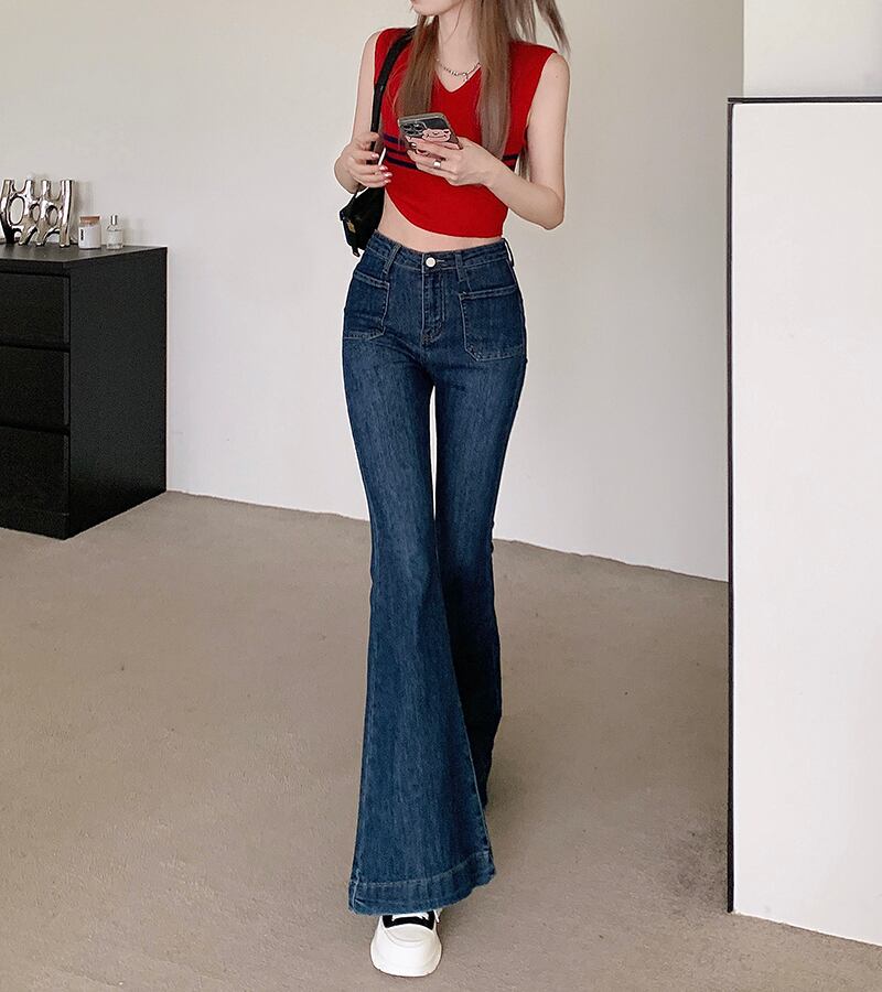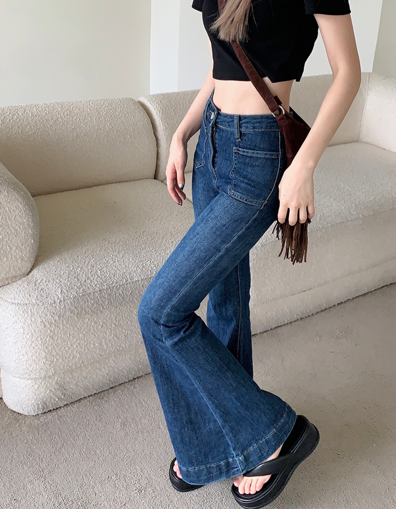 青いハイウエストのレトロなジーンズの女性の 2022 年秋の新しい伸縮性のある小さなマイクロ フレア パンツ モップ パンツ ブルー エラスティック オータム 秋物 bstraw51976872439 | beaute25