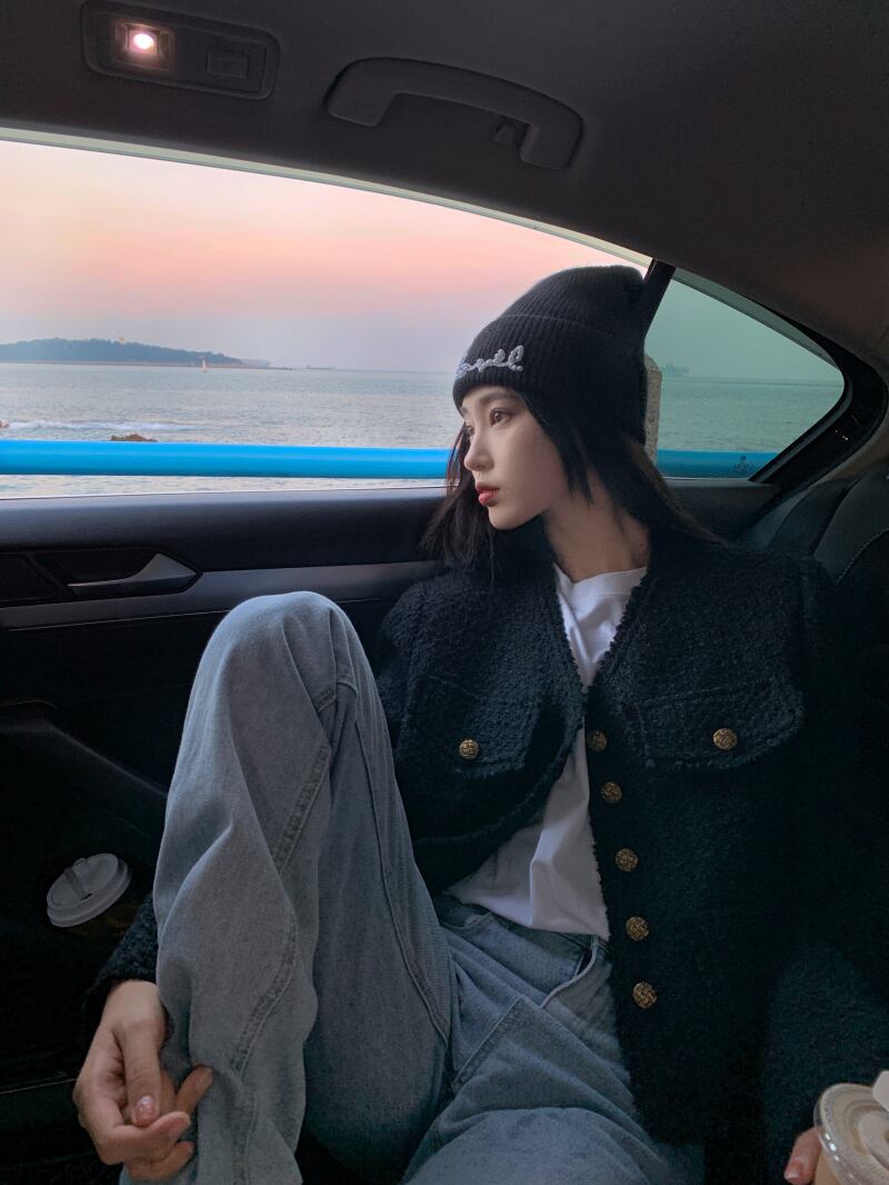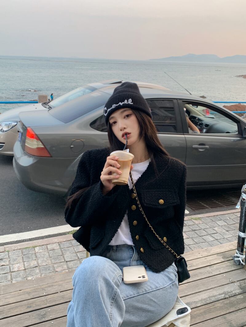 黒の小さなフレグランススタイルの長袖コートの女性の秋の新しい女性の気質のハイエンドルーズVネックショートトップ ロング ブラック オータム 秋物 bstraw14933804029 | beaute25