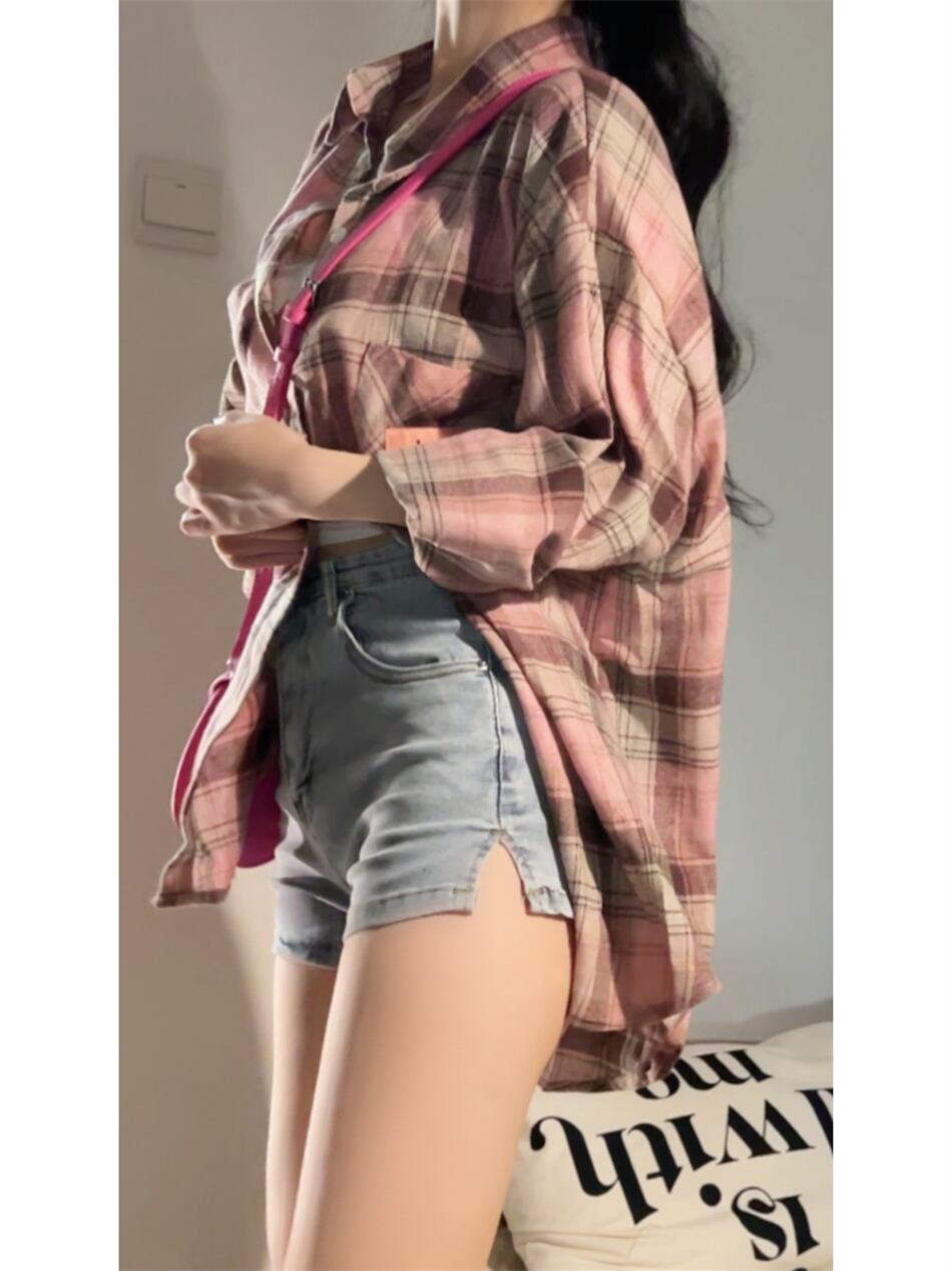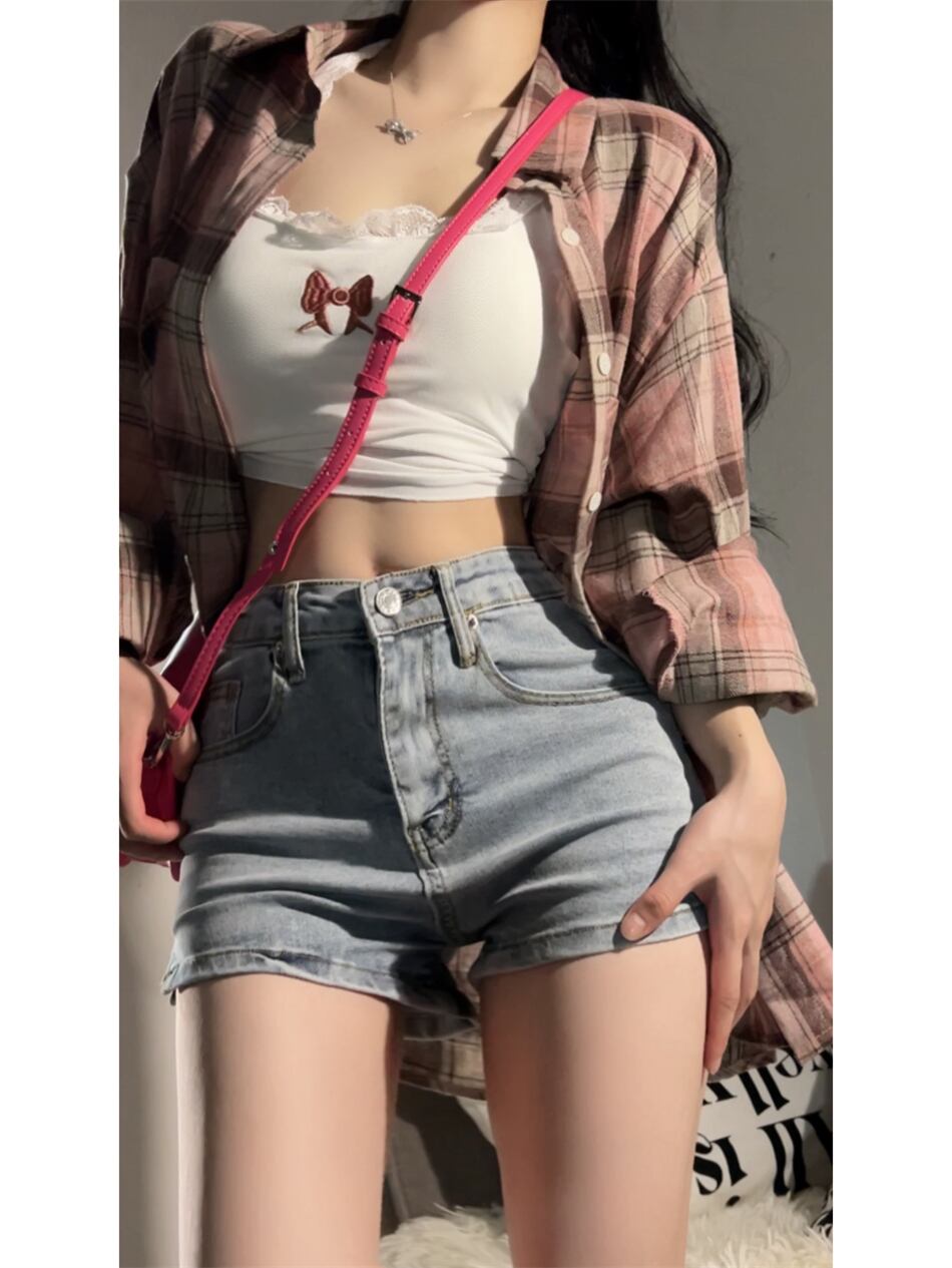 色:ピンクの格子縞のシャツ,ホルターベスト,デニムショートパンツ