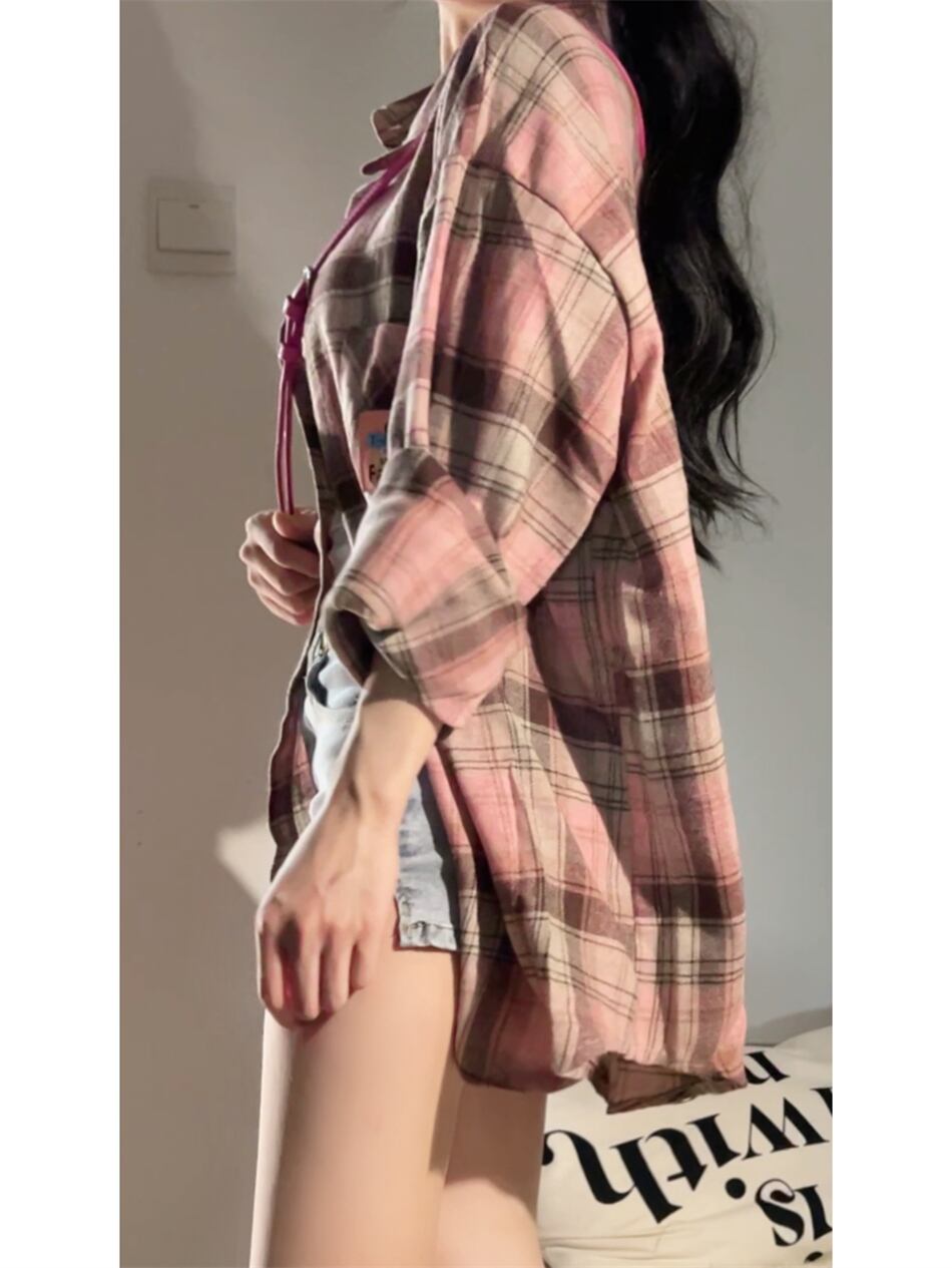 香港スタイルのレトロな格子縞の長袖シャツ女性の秋の薄いセクション 2022 新しいルーズミドル丈カーディガン日焼け止めトップ ロング オータム 秋物 bstraw69011026423 | beaute25