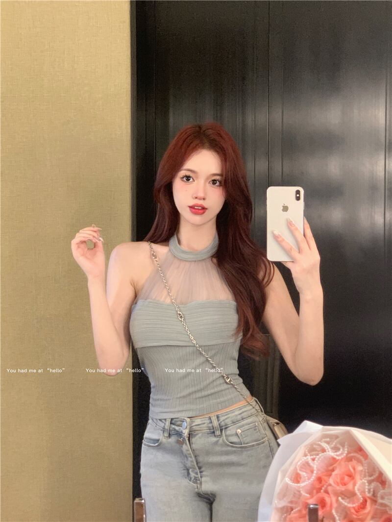 ピュアデザイア風ホルターネックキャミソールベスト レディース 夏 メッシュ ショートセクション オープンバック セクシー ノースリーブ トップス アウター サマー 夏物 bstraw55299482425 | beaute25