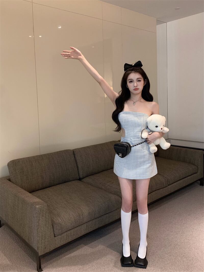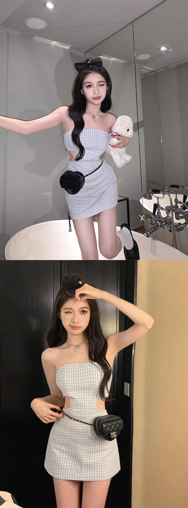 Xiaoxiangfeng 千鳥格子ドレス女性の夏のセクシーな単語シックな中空ショート スカート ウエスト バッグ ヒップ スカート サマー 夏物 bstraw6717966965 | beaute25