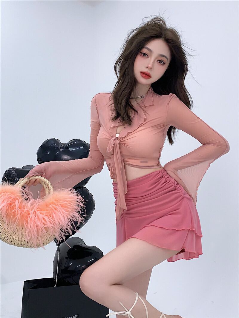ピンク メッシュ シャツ女性の秋のセクシーなレースアップ シャツ フレンチ ホット ガール タイト スリム長袖ショート トップ ロング オータム 秋物 bstraw41442900786 | beaute25