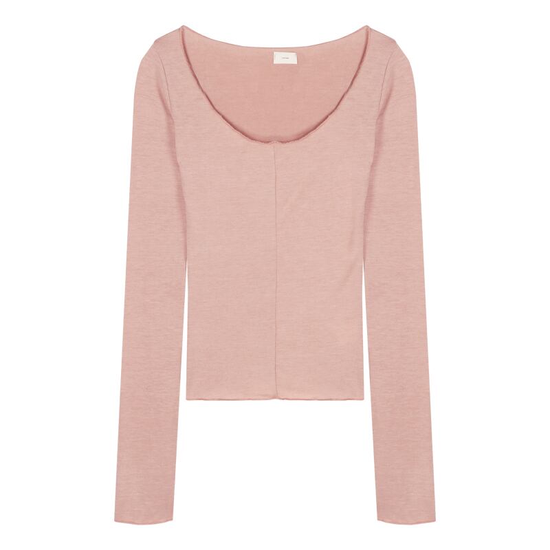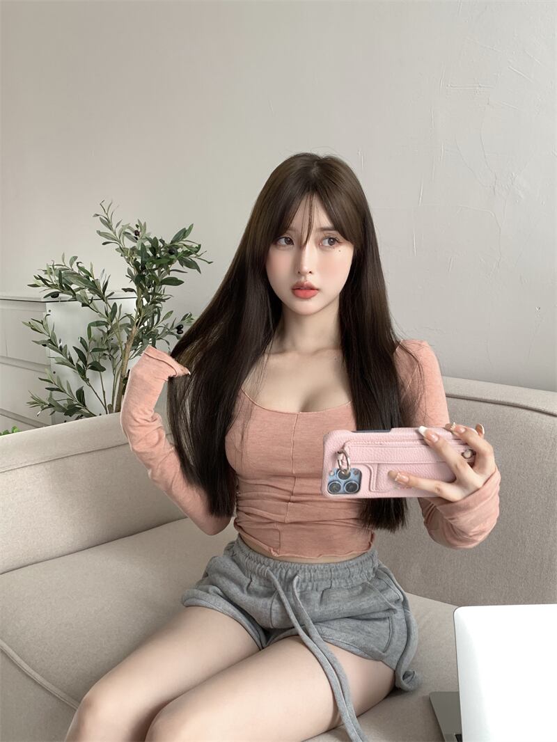 ピンクのスクエアネックの長袖Tシャツの女性の秋のソフトワックスのような純粋な欲望の風セクシーなウエストボトムシャツスリムトップ ロング オータム 秋物 ピュア スクウェア bstraw54079208395 | beaute25