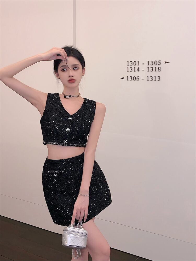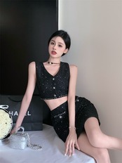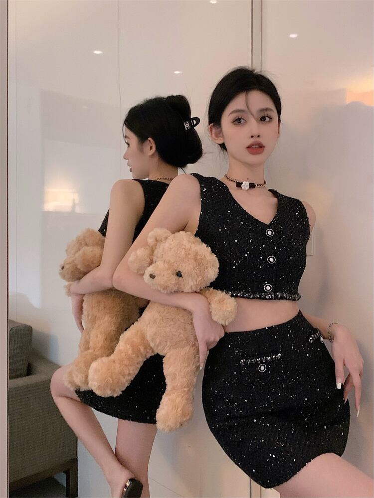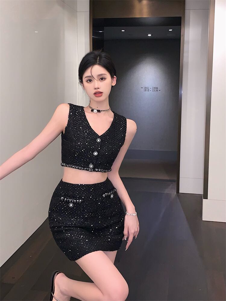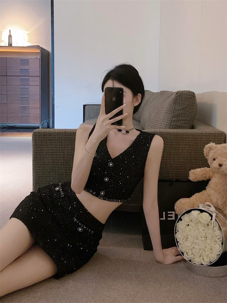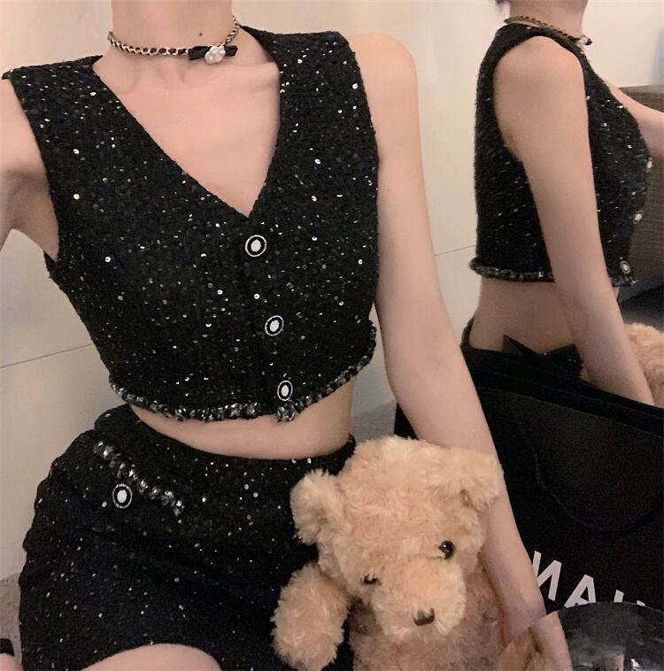 黒の小さな香りのスタイルのキャミソールの女性の夏の甘いスパンコールの気質の女性のハイエンドのショートトップの上着 ブラック 大人ガーリー スウィート キュート カジュアル サマー 夏物 bstraw62267273545 | beaute25