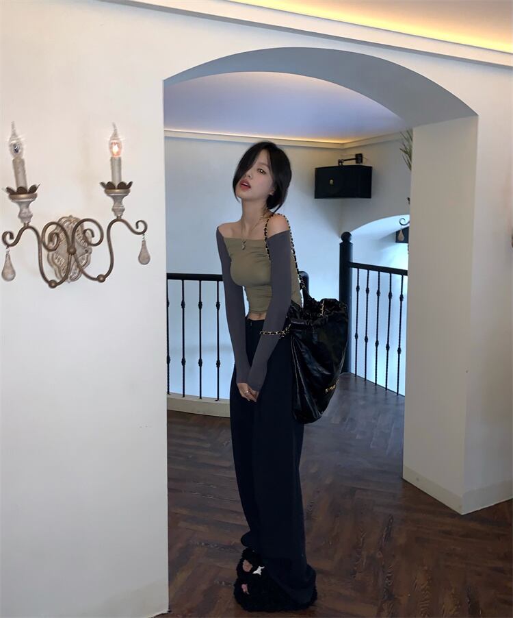 ワンショルダーTシャツ レディース 秋 コントラストカラー ステッチ レトロ オフショルダー セクシー タイトフィット 薄手 長袖 ショートトップ ロング オータム 秋物 bstraw31633356854 | beaute25