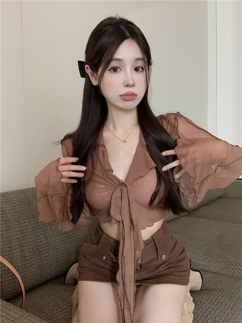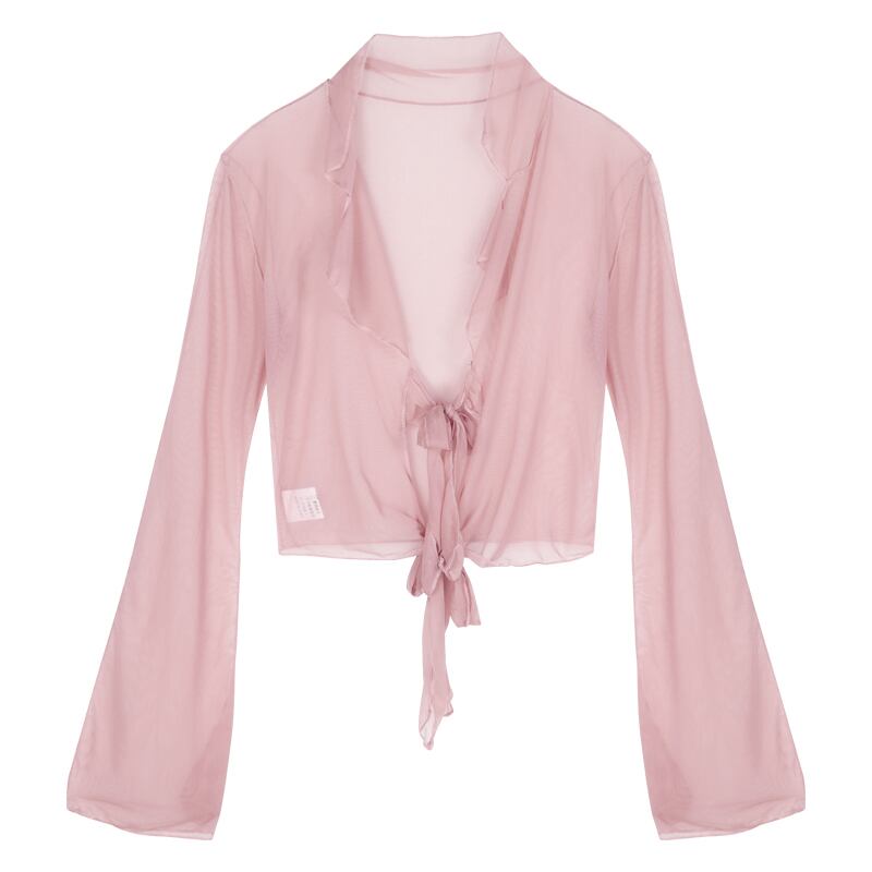 ピンク フレンチ メッシュ長袖シャツ女性の秋の薄いホット ガール V ネック透視シックなセクシーなショート トップ ロング オータム 秋物 Vネック bstraw35890961706 | beaute25