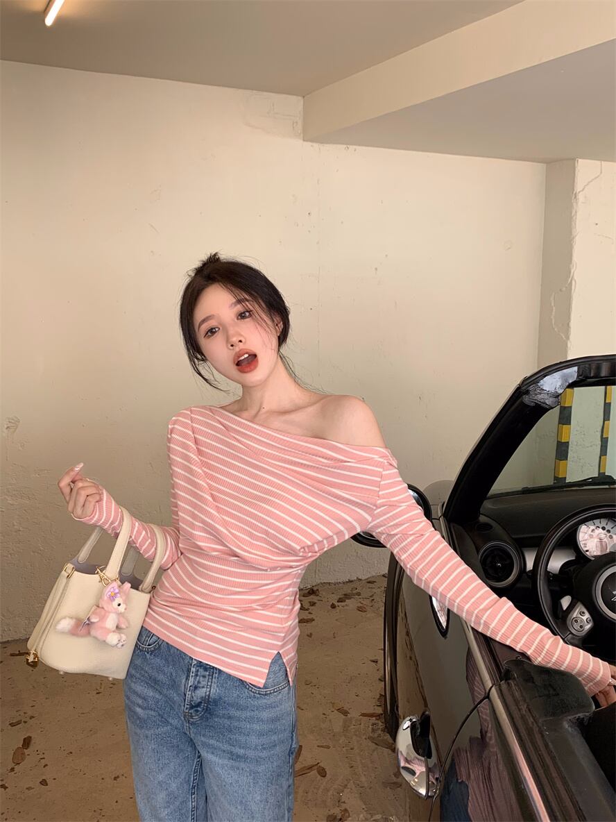ピンク 斜め肩 ストライプ 長袖 Tシャツ レディース 秋 スプリット デザイン センス 丁寧 マシンウエスト スリム トップス ロング オータム 秋物 bstraw3145437735 | beaute25