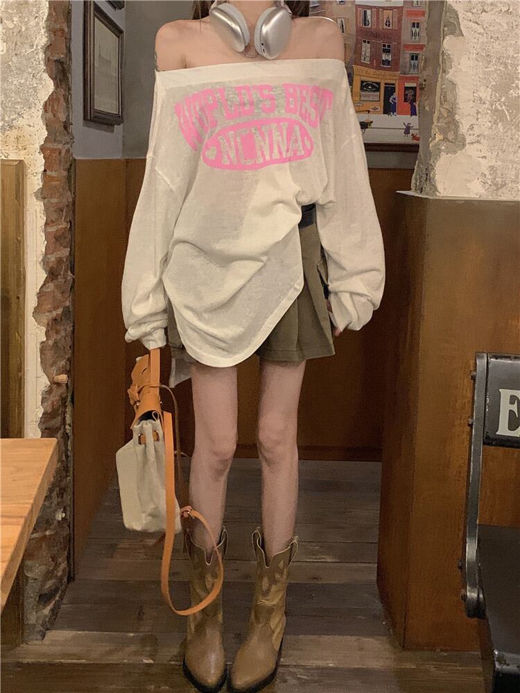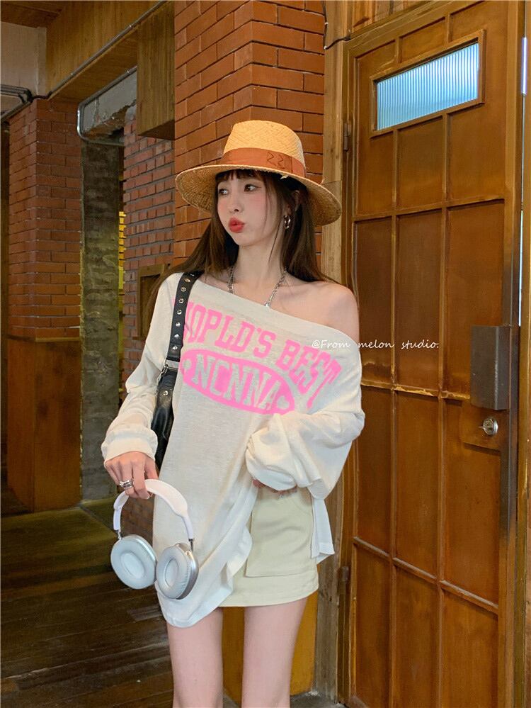 アメリカン レトロ ワンショルダー 長袖 Tシャツ レディース 秋 文字 薄手 日焼け止め ブラウス ミドル丈 トップス ロング オータム 秋物 bstraw85607046653 | beaute25