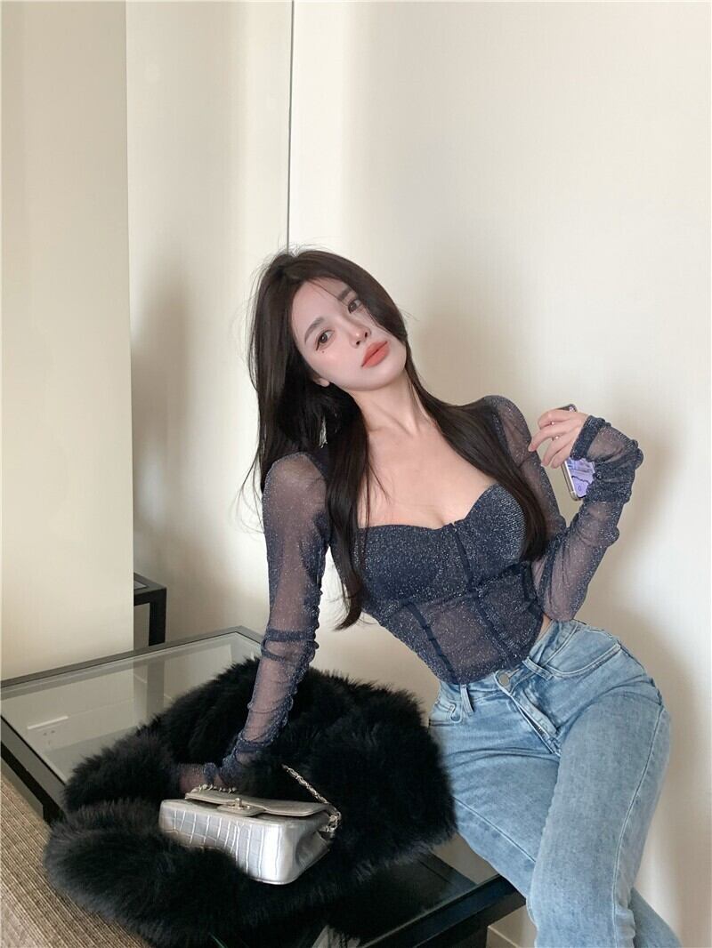 ホットガールメッシュセクシーな長袖シャツ女性の秋の純粋な欲望風やや透明スクエアカラーシャツスリムトップ ロング オータム 秋物 ピュア スクウェア bstraw68236718754 | beaute25
