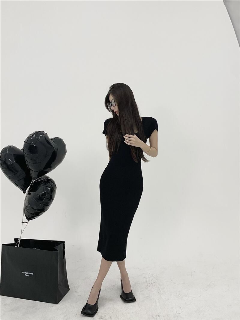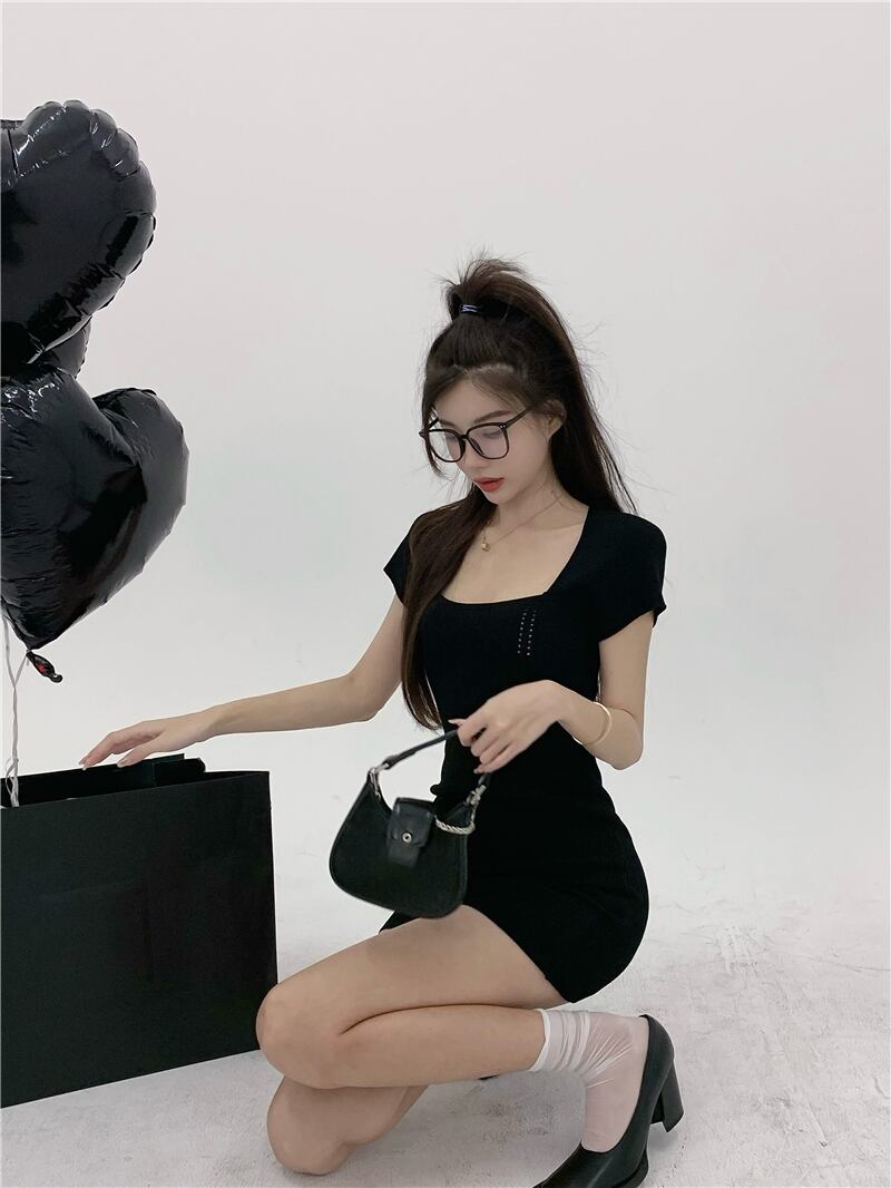 ニット半袖ドレス女性の夏の黒のスクエア ネック ウエスト気質ショート スカート タイト フィット痩身ヒップ スカート ブラック サマー 夏物 スクウェア bstraw68900802023 | beaute25