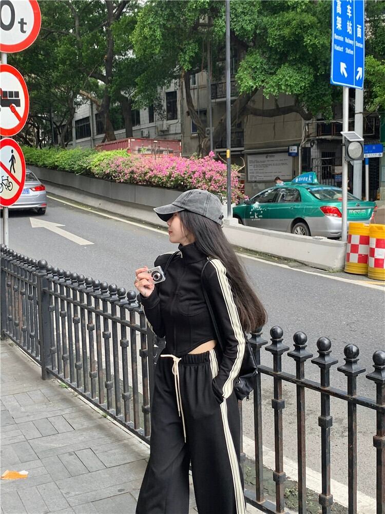 黒ストライプスポーツカジュアルパンツレディース春オールマッチゆったりハイウエスト薄手ワイドパンツモップパンツ ハイウェスト ブラック スプリング 春物 bstraw99109056637 | beaute25