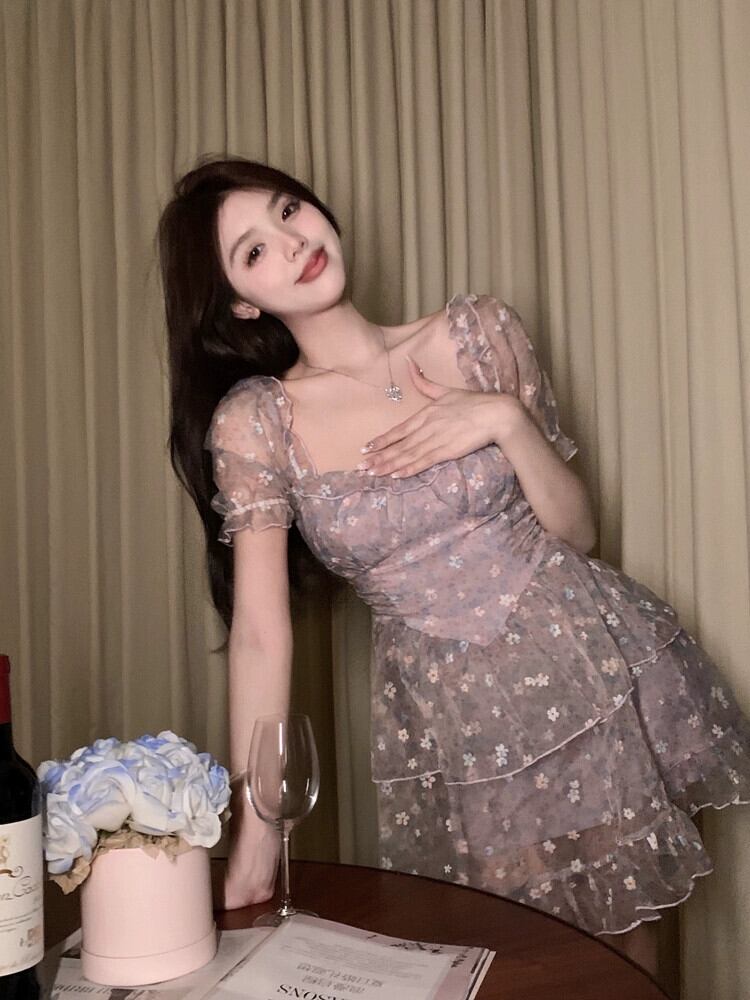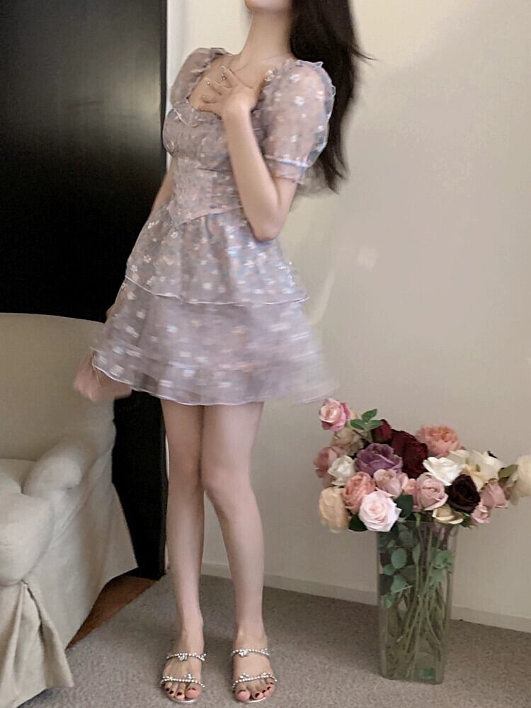 甘い花柄メッシュ半袖ドレス女性の夏甘いセクシーなシフォンスクエアカラーふわふわプリンセスショートスカート 大人ガーリー スウィート キュート カジュアル サマー 夏物 スクウェア bstraw91627467576 | beaute25