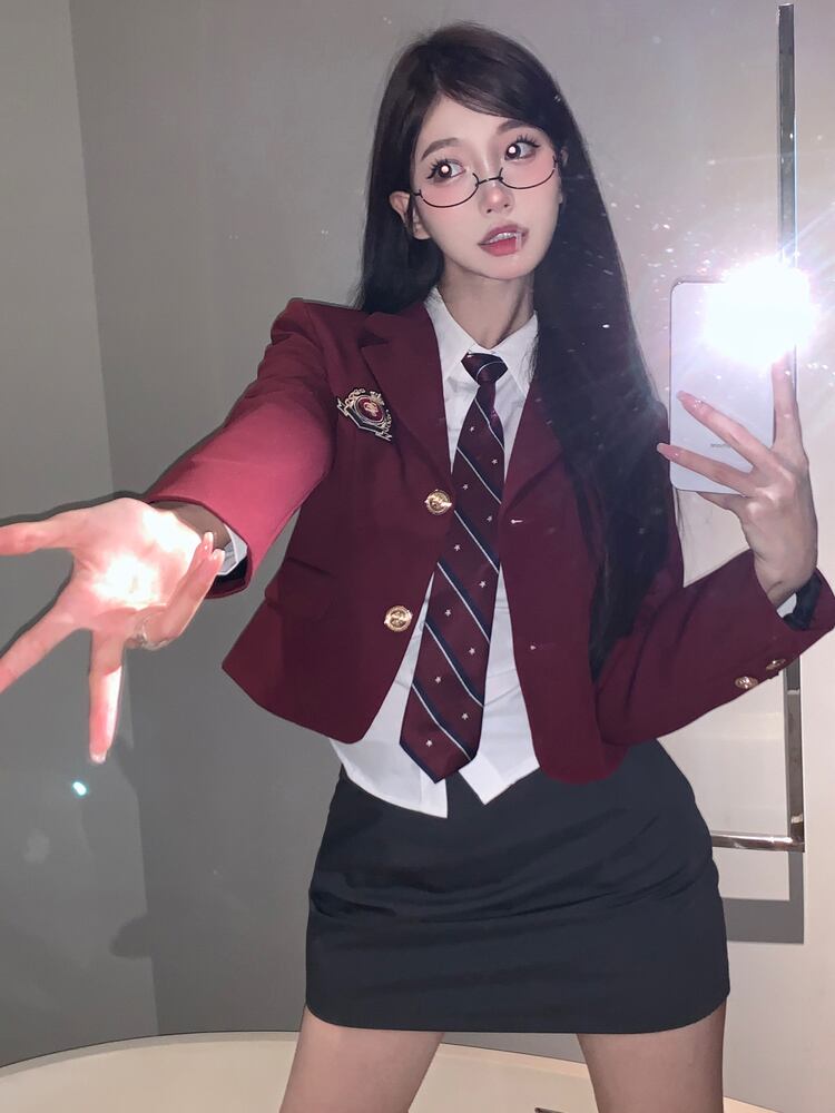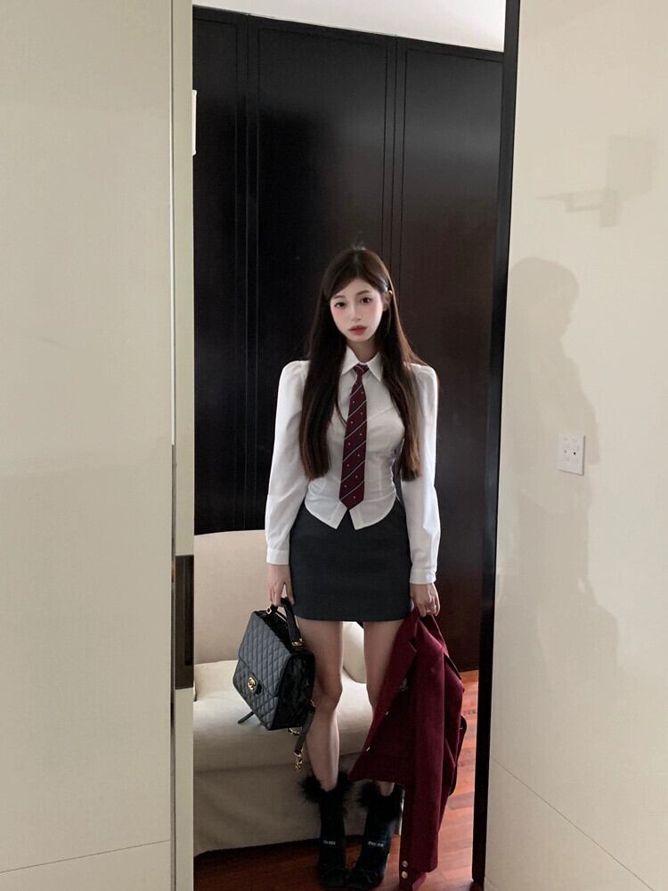色:結ぶシャツ,ブルゴーニュスーツ,グレーのバッグヒップスカート