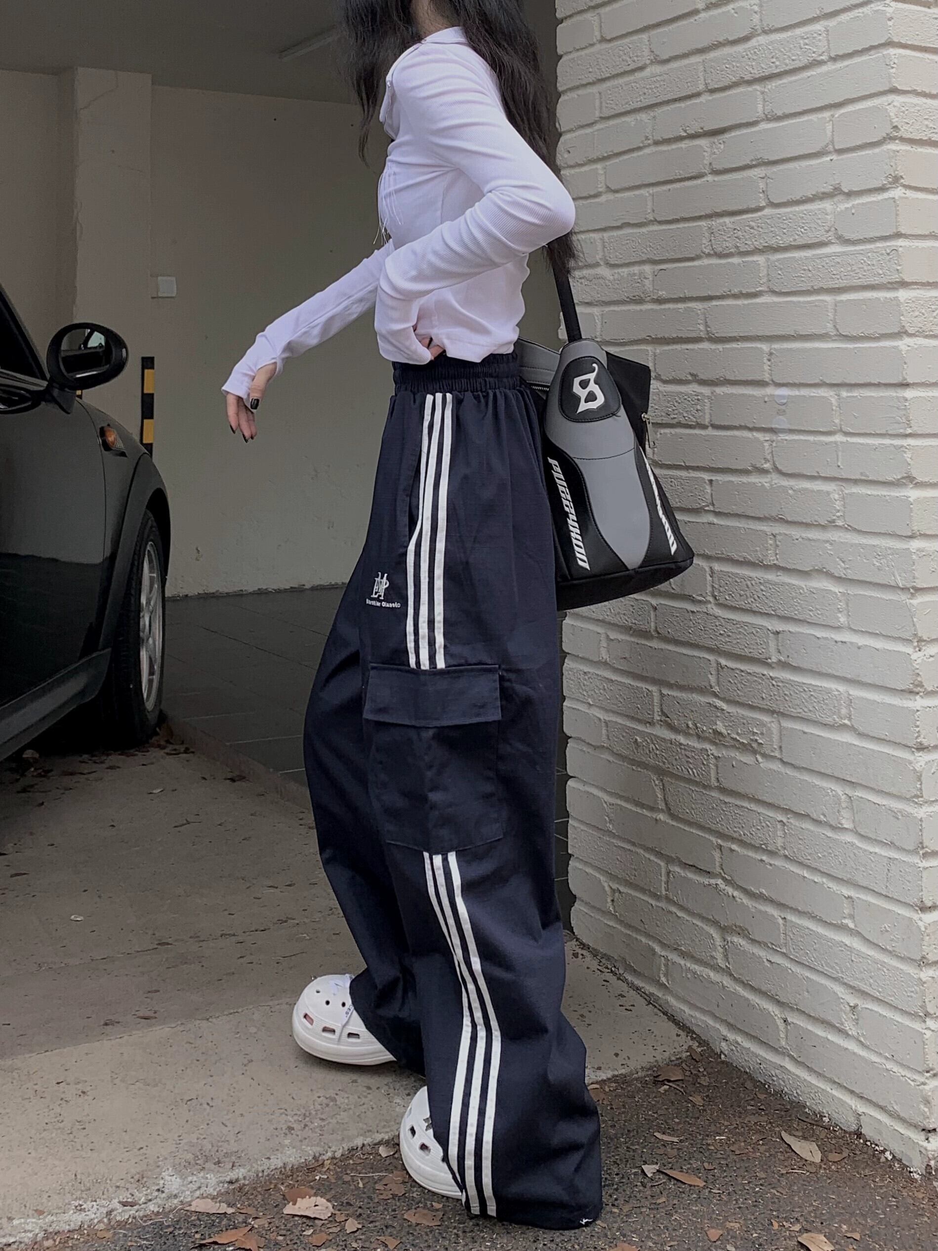 ブラックストライプスポーツカジュアルパンツレディース2023春新作パンツハイウエストストレートスリムワイドレッグパンツ ハイウェスト スプリング 春物 ワイドパンツ bstraw37599681135 | beaute25
