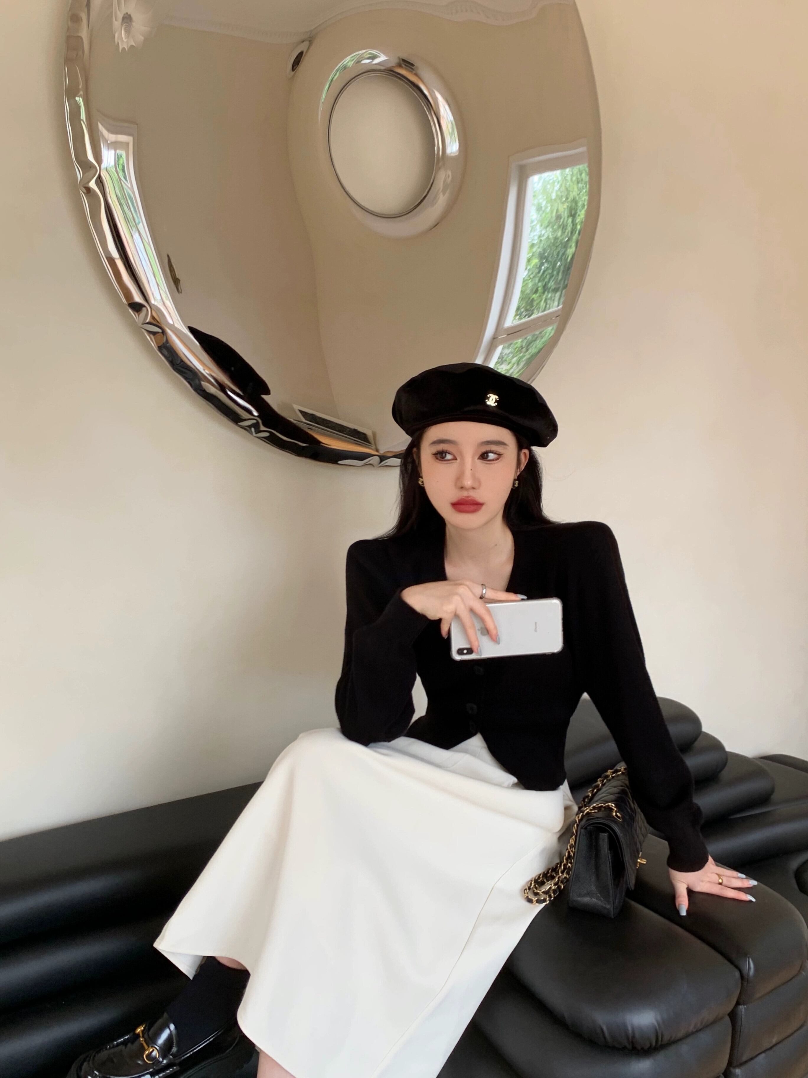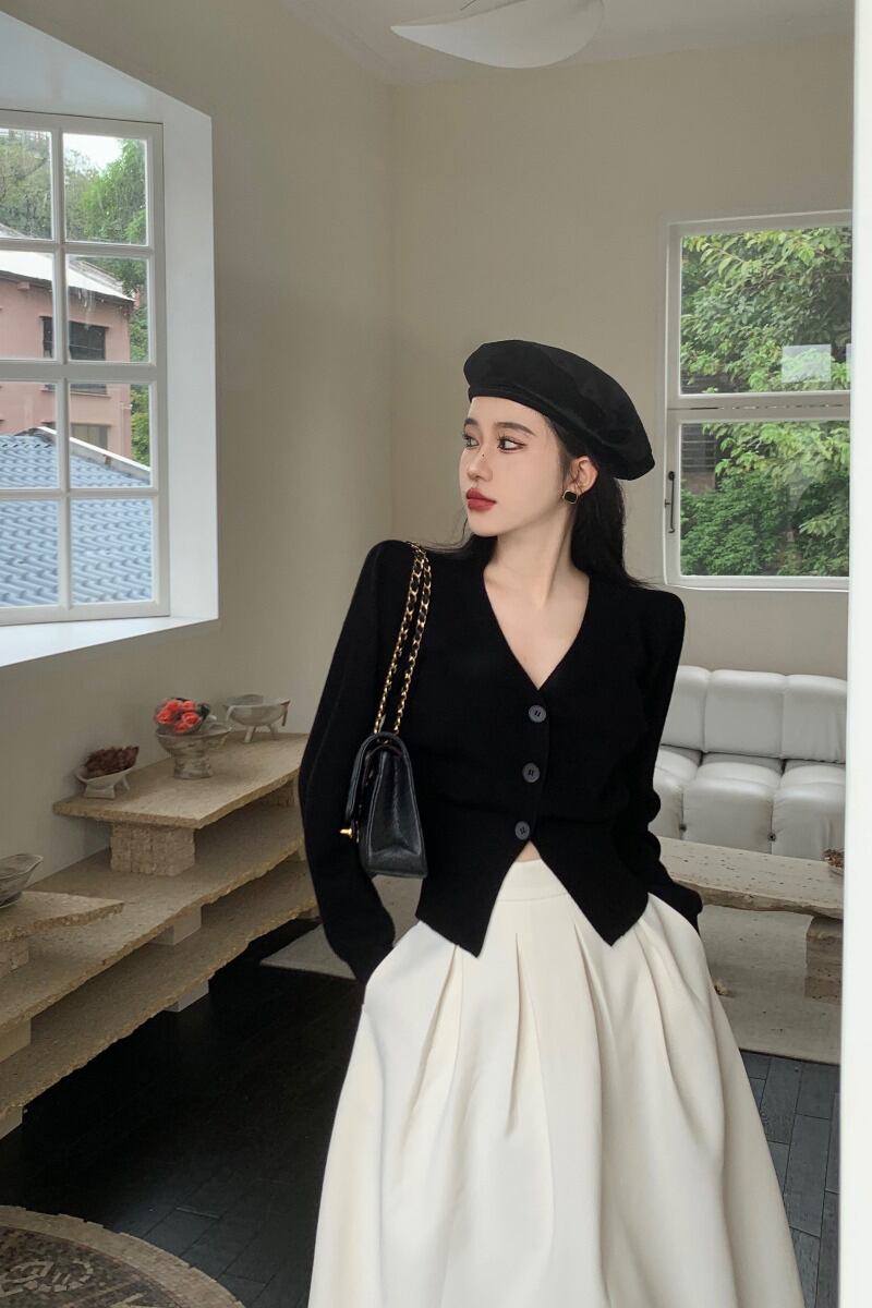 黒の V ネック長袖ニットカーディガン女性の 2023 年春の新しいデザインセンス気質スリムフィットと薄いショートトップ ロング ブラック スプリング 春物 Vネック bstraw35605850796 | beaute25