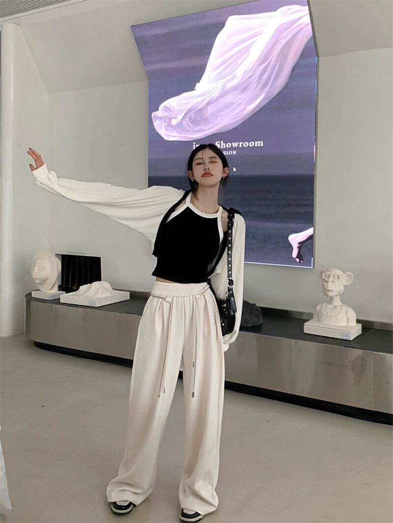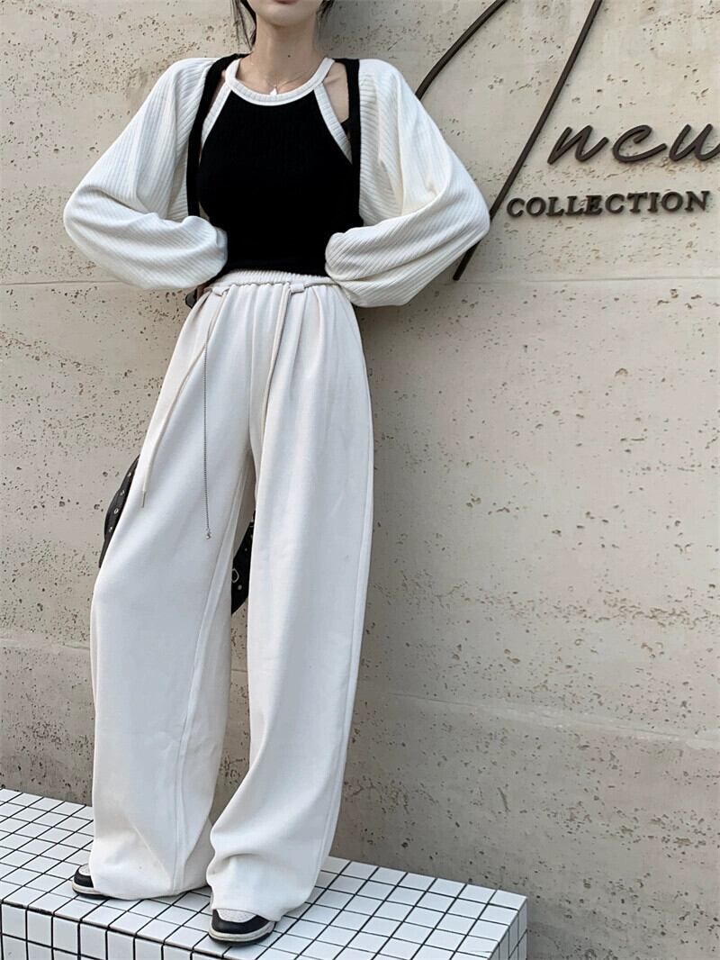 黒巾着ストレートカジュアルパンツ女性の秋冬 2022 新しい肥厚ルーズドレープワイドレッグパンツモップパンツ ブラック オータム 秋物 ウィンター 冬物 bstraw67135962391 | beaute25