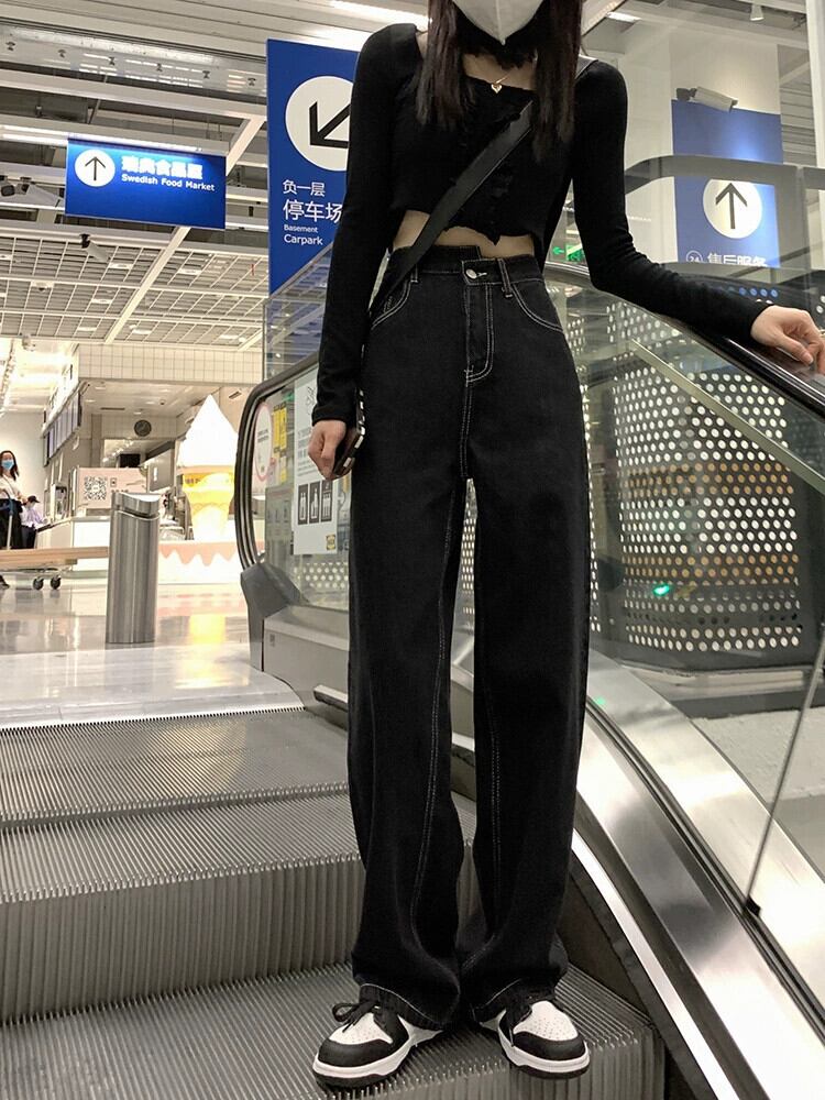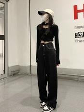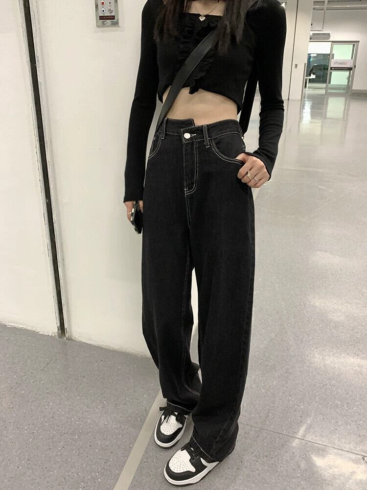 黒のハイウエスト ストレート ジーンズの女性の 2023 春と秋の新しい小さなルーズ ワイドレッグ パンツ モップ パンツ トレンド ブラック スプリング 春物 オータム 秋物 bstraw41432514082 | beaute25