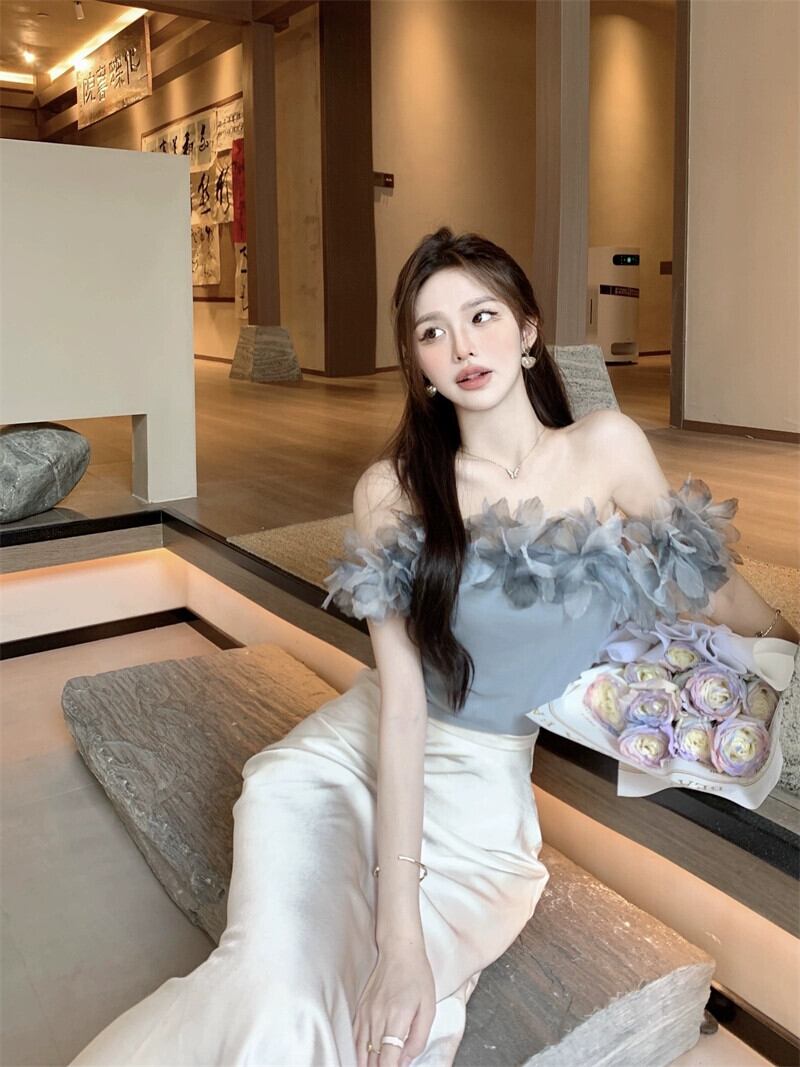 グレーの立体フラワーキャミソール女性の夏の純粋な欲望スタイルのセクシーなノースリーブワンショルダーショートトップ サマー 夏物 ピュア フラワーデザイン bstraw58217575552 | beaute25