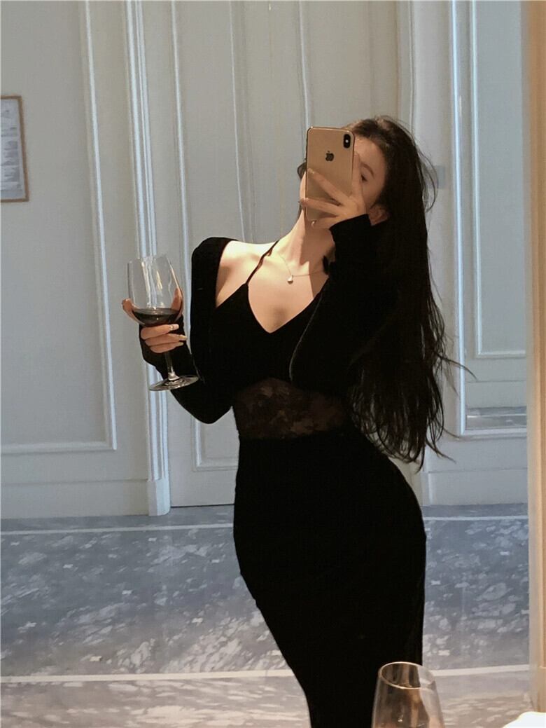 黒のスリット長袖ドレスの女性の春純粋な欲望風ベルベット中空レースステッチミッドレングスヒップスカート ロング ブラック スプリング 春物 ピュア bstraw21468583038 | beaute25