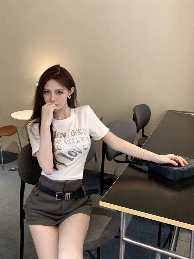 白い立体文字半袖Tシャツ女性の夏甘い小さなへそデザインセンスニッチショートトップ ホワイト 大人ガーリー スウィート キュート カジュアル サマー 夏物 bstraw1576485636 | beaute25
