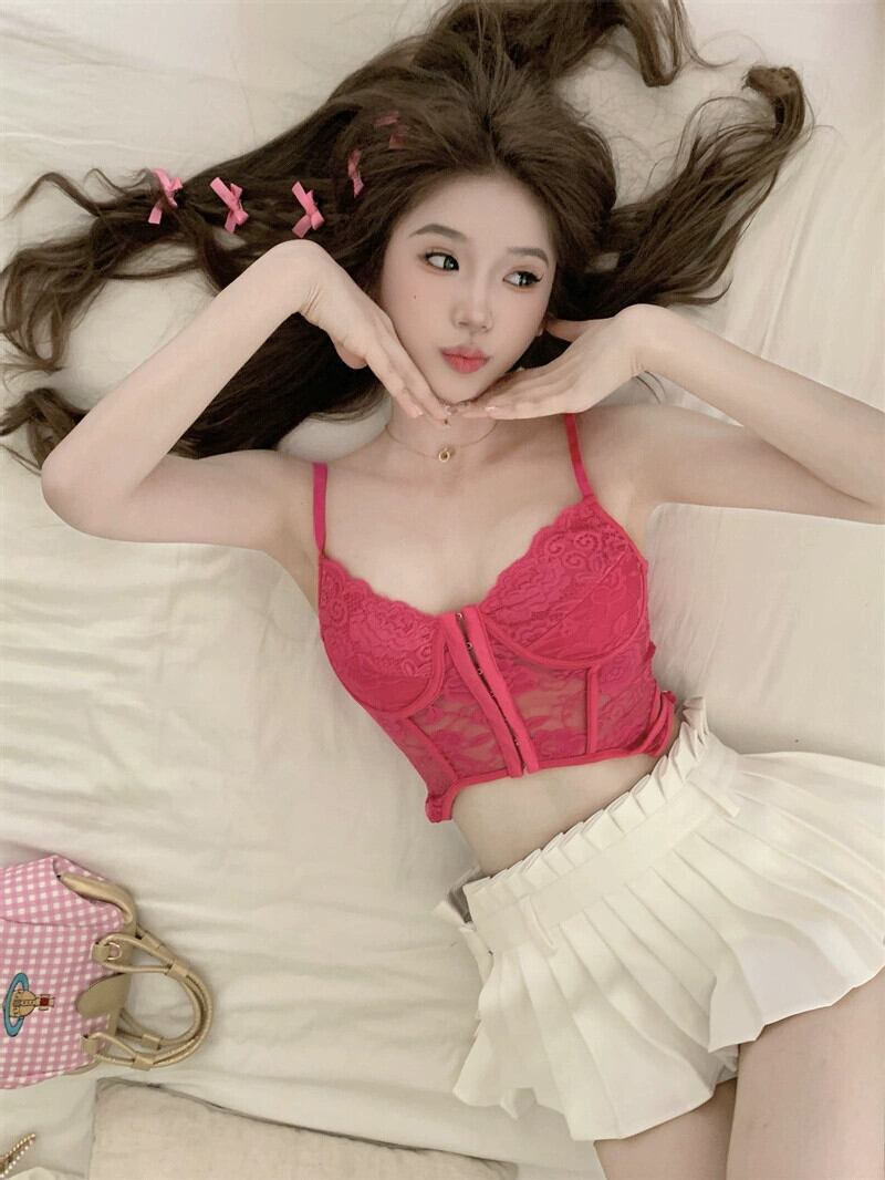 色:ホワイトプリーツウエストスーパーショート,ピンクのレースのベスト