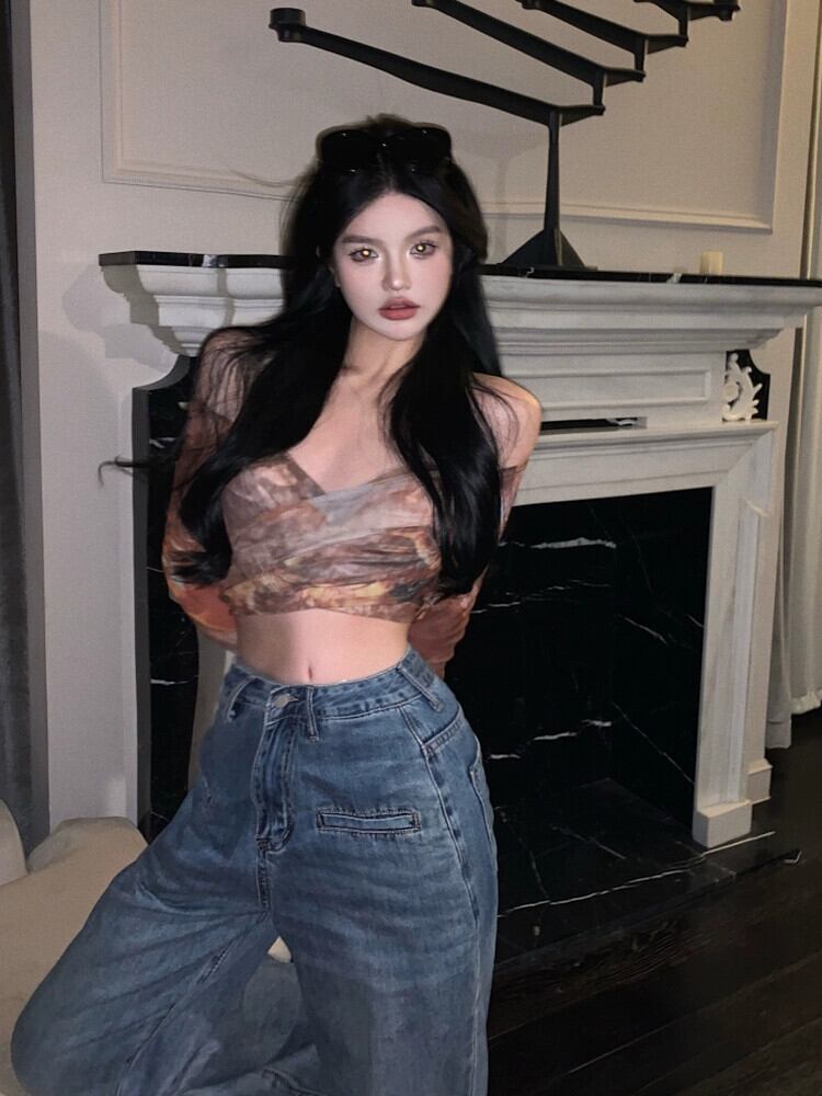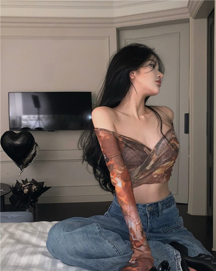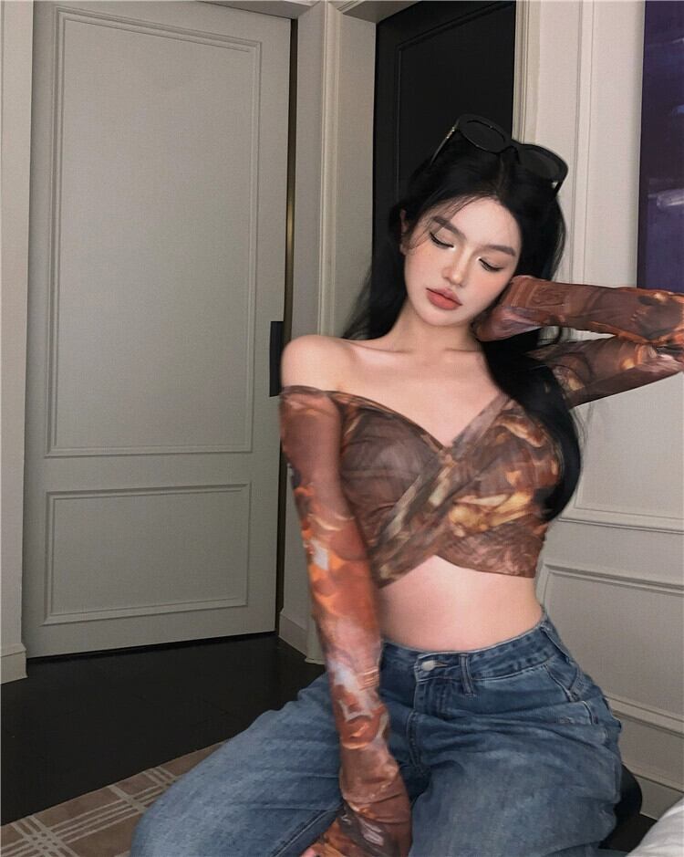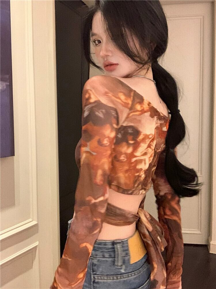 スパイスタイダイ V ネック長袖 Tシャツ女性の夏の純粋な欲望ハイウエストセクシーなストラップスリムショートボトシャツトップ ハイウェスト ロング サマー 夏物 Vネック ピュア bstraw93013212266 | beaute25