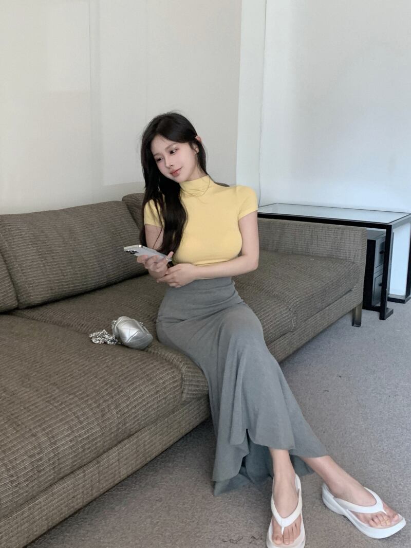 色:グレーマーメイドスカート,明るい黄色のトップ