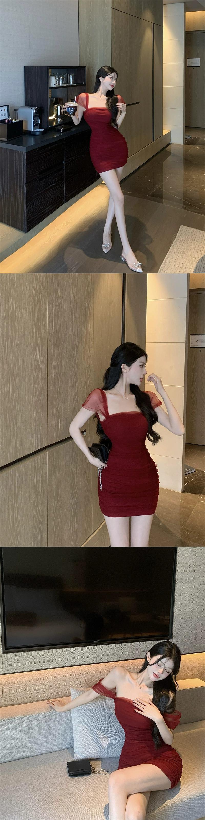 純粋な欲望風スクエアカラーメッシュ半袖ドレス女性の夏のスカートハイエンド気質気質ウエストウエスト薄型パッケージヒップスカート サマー 夏物 スクウェア bstraw72821460138 | beaute25