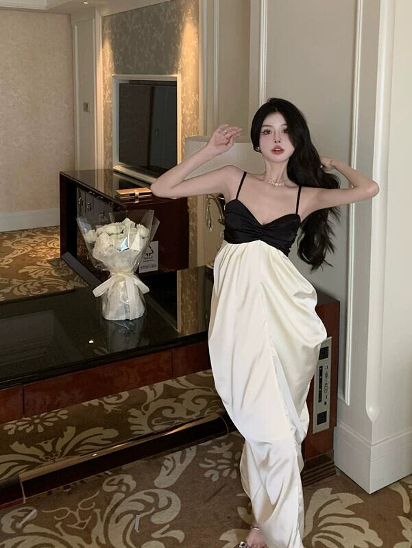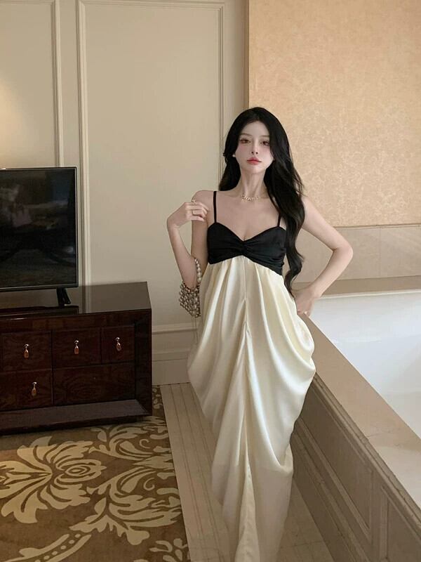 フランスのハイエンドサスペンダードレスの女性のサマースカートスプライシングティーブレイクノースリーブaライン気質vネックミッドレングススカート 夏物 bstraw43583867401 | beaute25