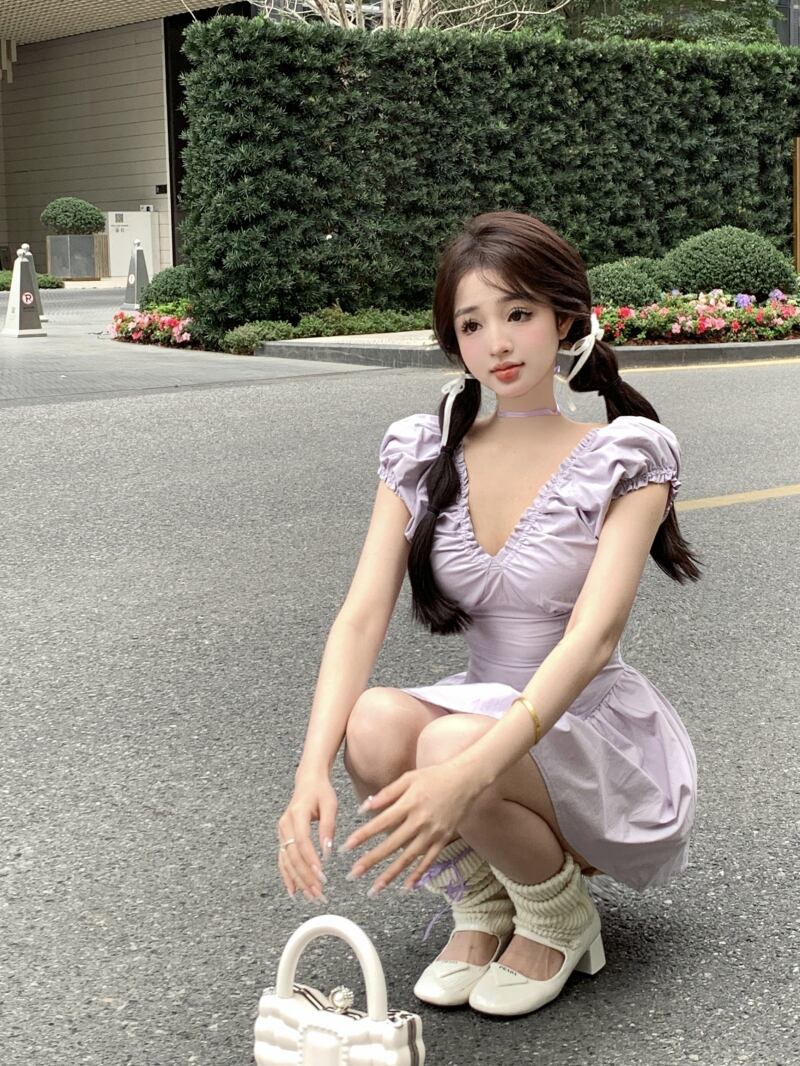 甘い V ネック半袖ドレス女性の夏パープルスカートパフスリーブ小さな A ラインウエストスリムスカート 大人ガーリー スウィート キュート カジュアル サマー 夏物 Vネック Aライン bstraw31945868391 | beaute25