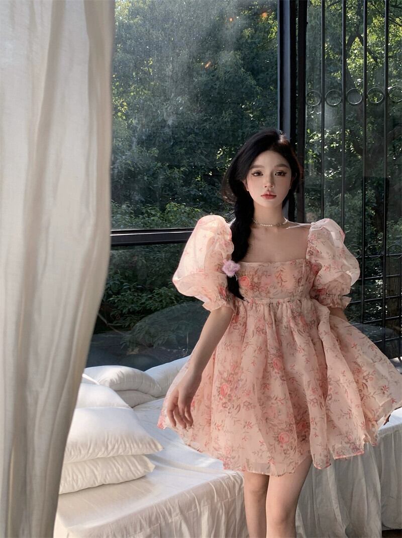 甘い花柄スクエアネック半袖ドレス女性の夏フレンチバレエスタイルスカートパフスリーブふわふわスカート 大人ガーリー スウィート キュート カジュアル サマー 夏物 スクウェア bstraw14100765834 | beaute25