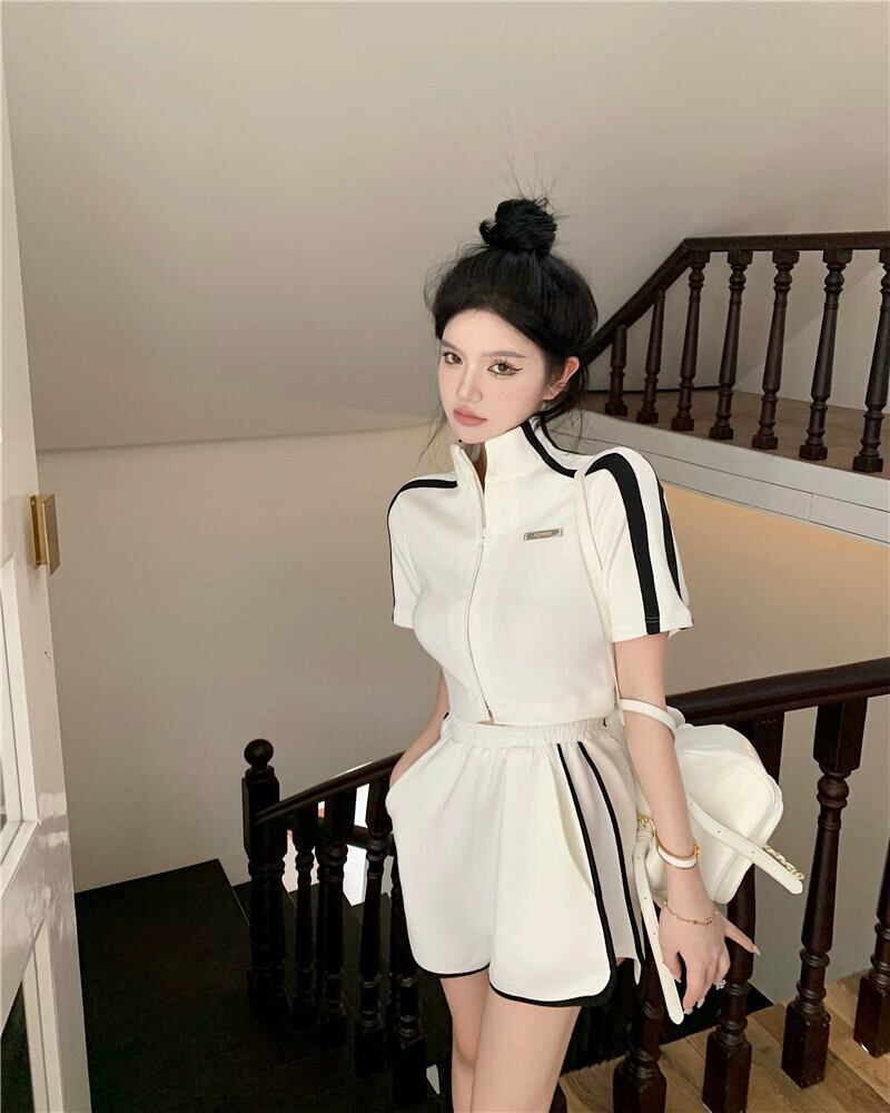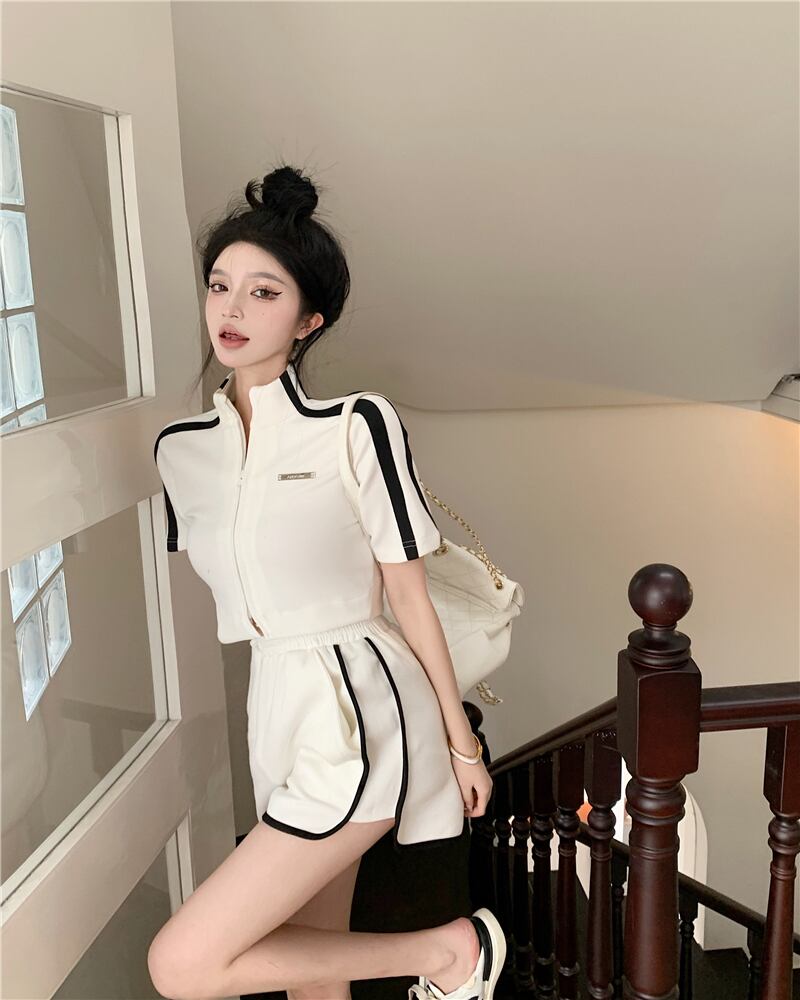 スポーツ・レジャースーツ スタンドカラー 半袖 ジッパー Tシャツ トップス レディース 夏 ハイウエスト 薄手パンツ ショーツ 2点セット ハイウェスト サマー 夏物 ブルマー bstraw76465828387 | beaute25