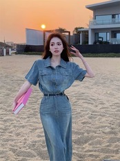 香港スタイルラペルウォッシュデニムシャツドレスレディースサマーワンピーススリットスカートフィッシュテールバッグヒップスカートロングスカート 夏物 bstraw36707496432 | beaute25