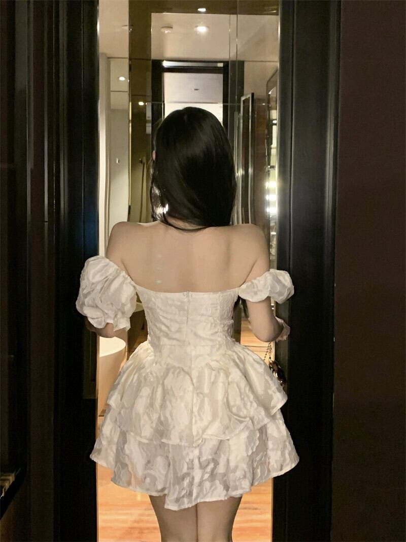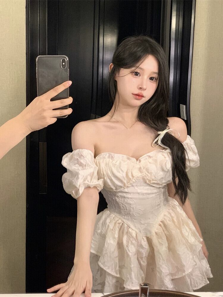 バレエスタイルの甘いバブル半袖ドレスの女性の夏のワンショルダースカートセクシーな純粋な欲望気質aラインスカート 大人ガーリー スウィート キュート カジュアル サマー 夏物 ピュア bstraw80606954072 | beaute25
