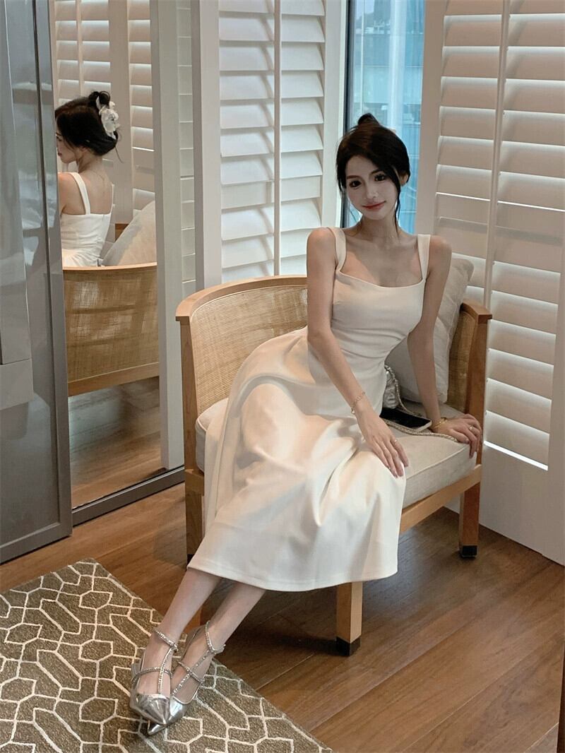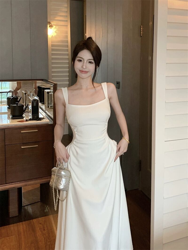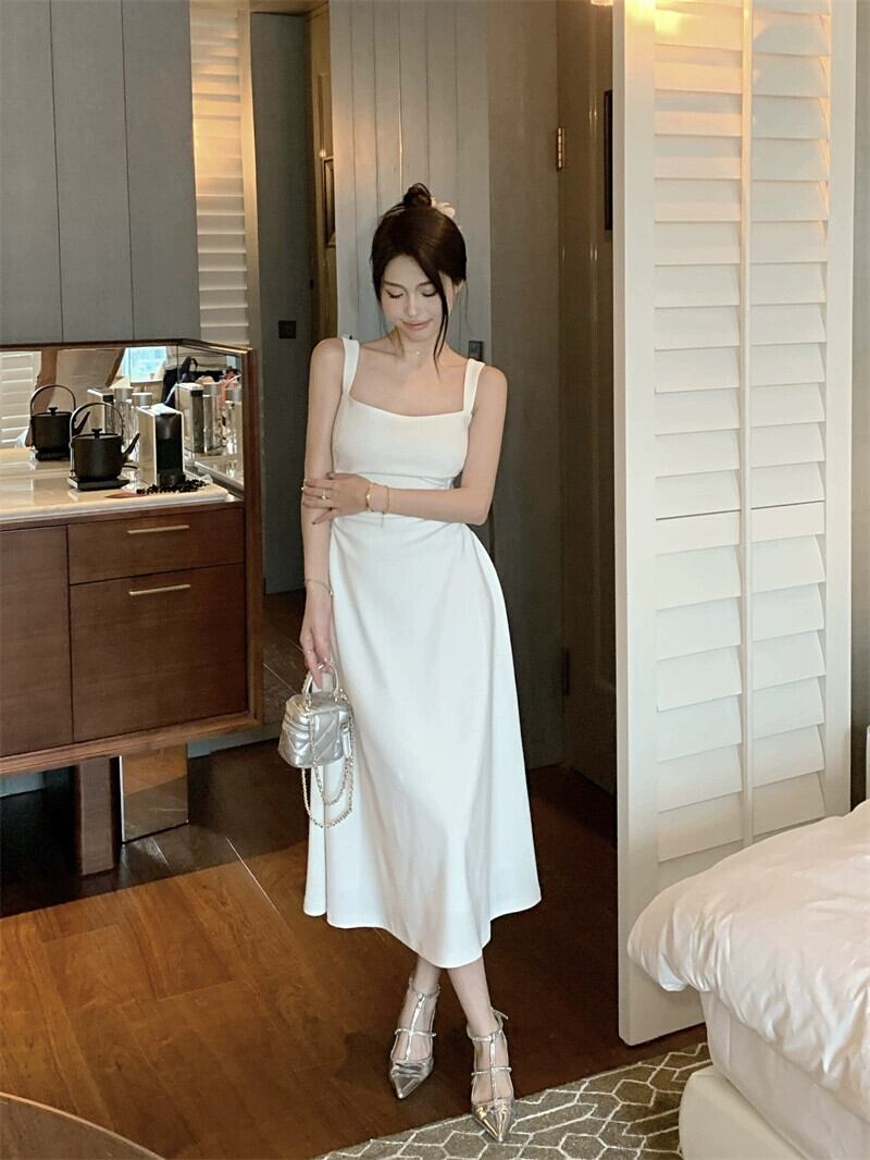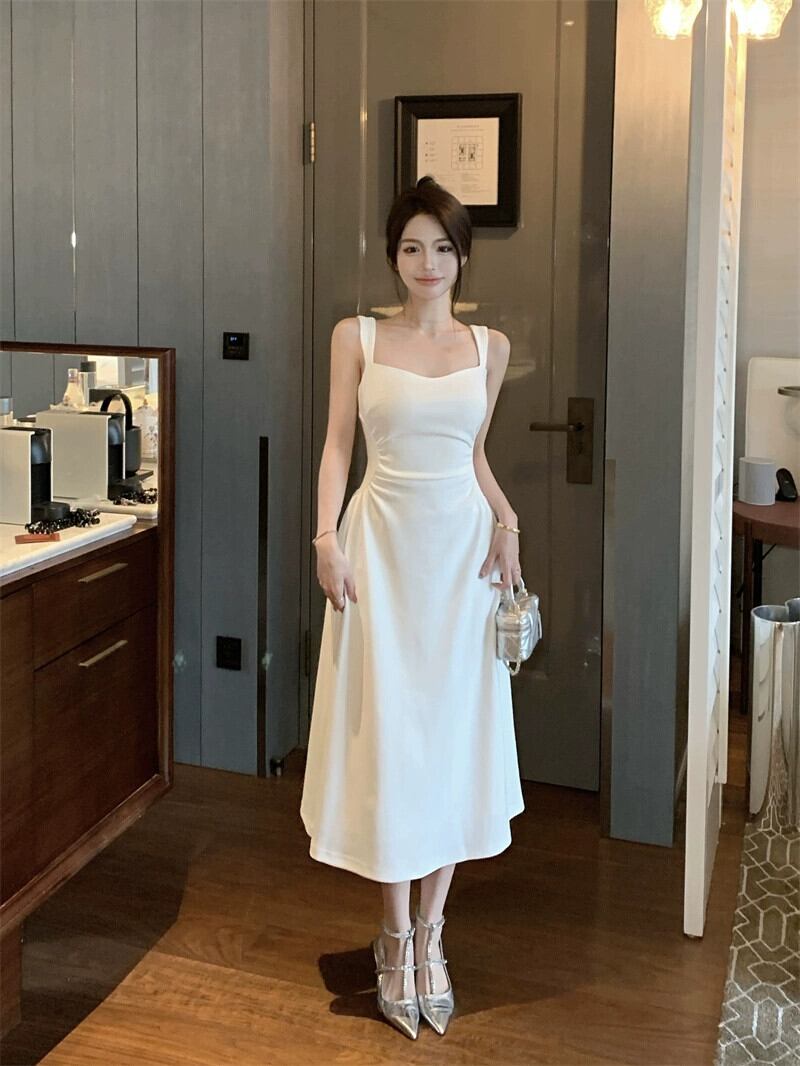 フレンチホワイト サスペンダードレス レディース 夏 清涼感 スクエアカラー スカート 美スリムウエスト Aライン ロングスカート サマー 夏物 スクウェア bstraw95949573286 | beaute25