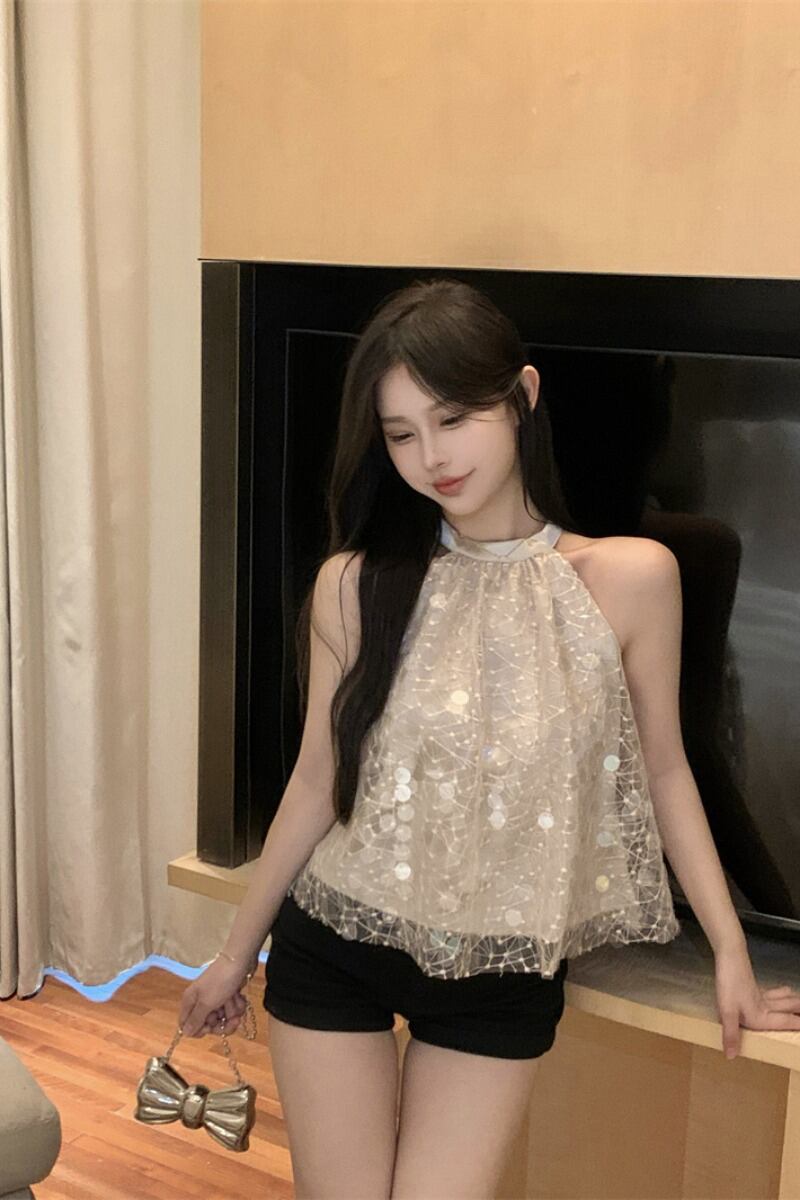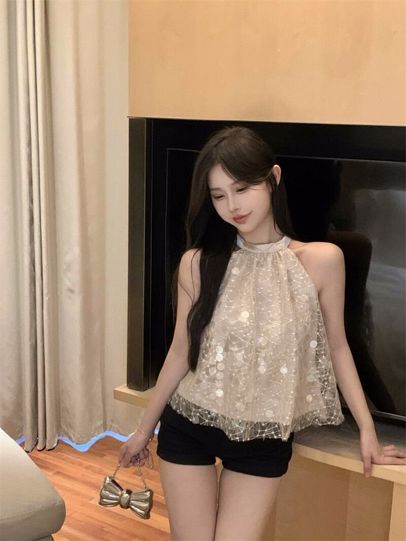 スパイスガール スパンコール シフォン キャミソール 夏 セクシー ノースリーブ スパークリング ホルター ネック ルーズ ショート トップ アウター サマー 夏物 bstraw67045521502 | beaute25
