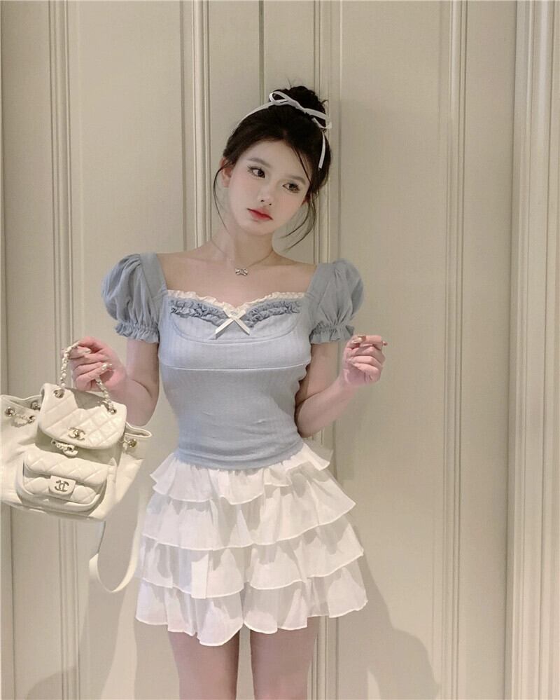 甘いちょう結び半袖シャツ女性の夏の純粋な欲望パフスリーブレーススリムフィットと薄いショートトップ リボン 大人ガーリー スウィート キュート カジュアル サマー 夏物 ピュア bstraw82700328823 | beaute25