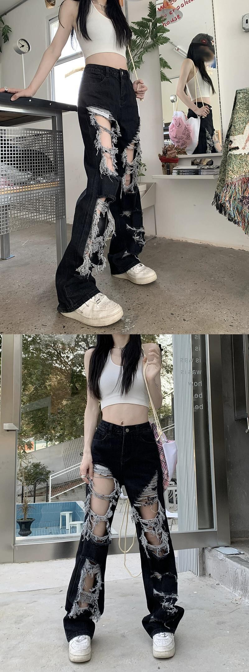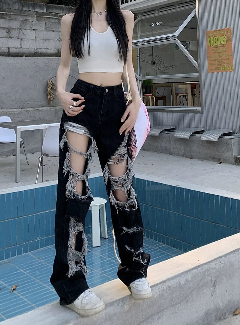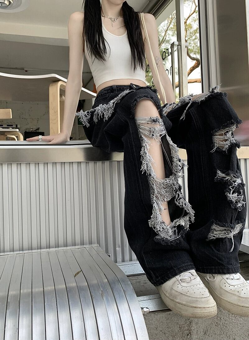 ストリートブラックリップドストレートジーンズ女性の夏アメリカンスタイルハイウエスト乞食パンツモップパンツワイドレッグパンツ ハイウェスト サマー 夏物 ワイドパンツ bstraw57476932016 | beaute25
