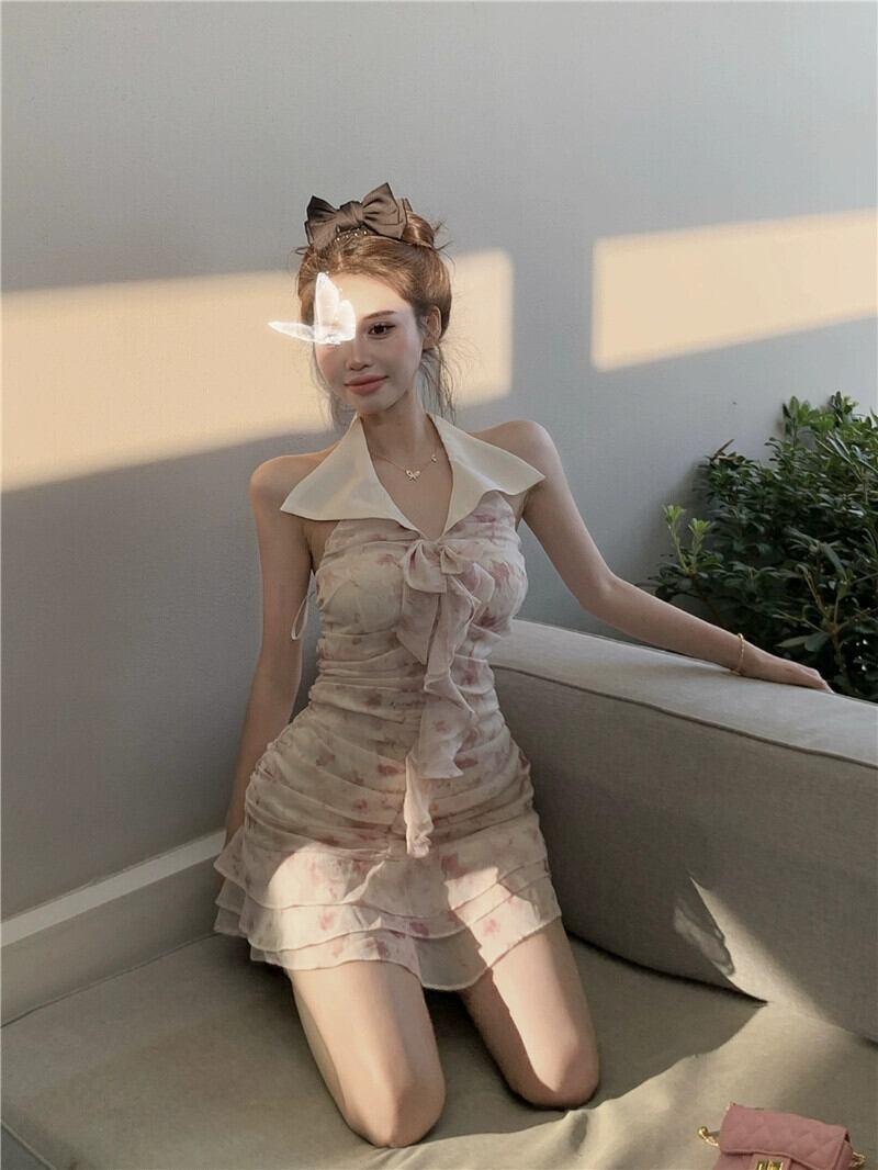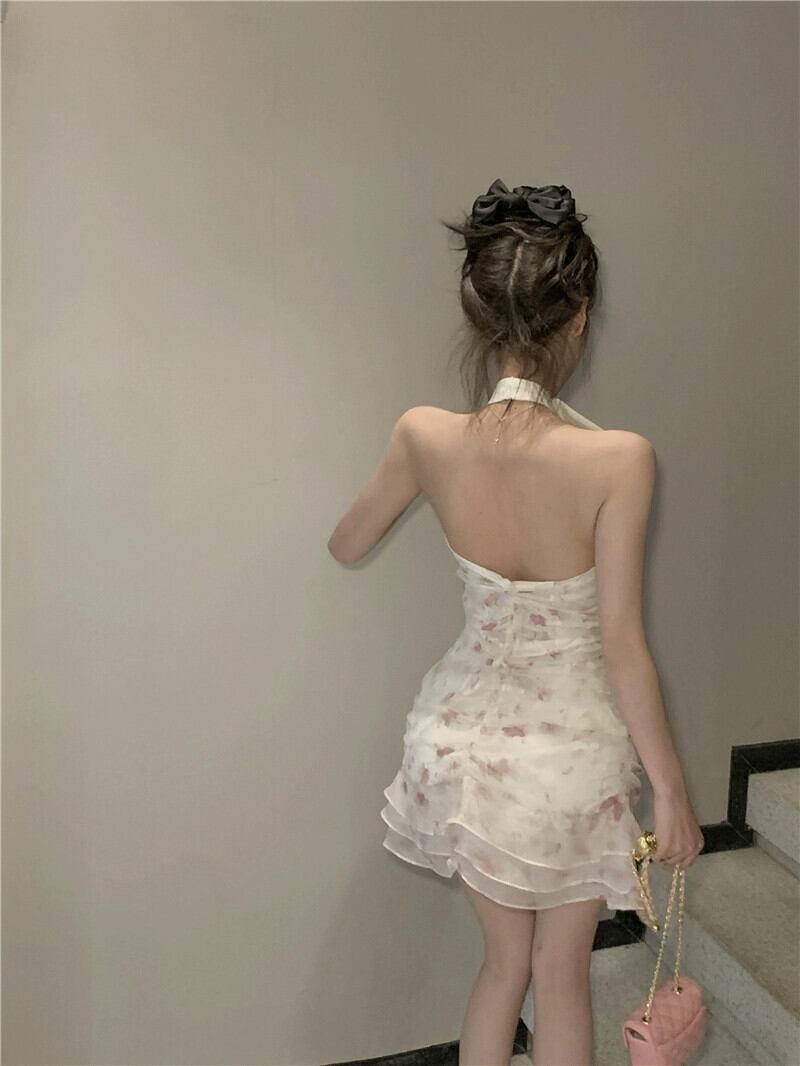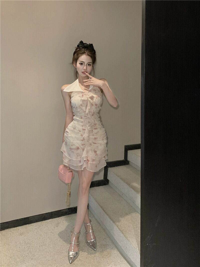甘いピンクの花柄ホルターネックドレス女性の夏の絞り染めスカートセクシーなプリーツフリルヒップスカートスカート 大人ガーリー スウィート キュート カジュアル サマー 夏物 bstraw34337803473 | beaute25
