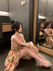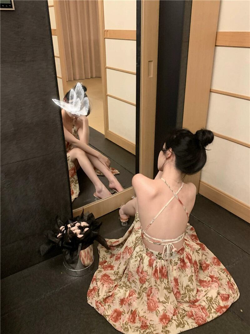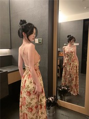 気質 V ネック花柄スリングドレス女性の夏の背中の開いた中空ストラップロングスカートハイウエストセクシーなスリットスカート ハイウェスト サマー 夏物 Vネック bstraw16467304901 | beaute25