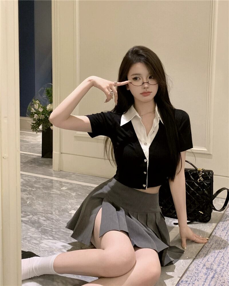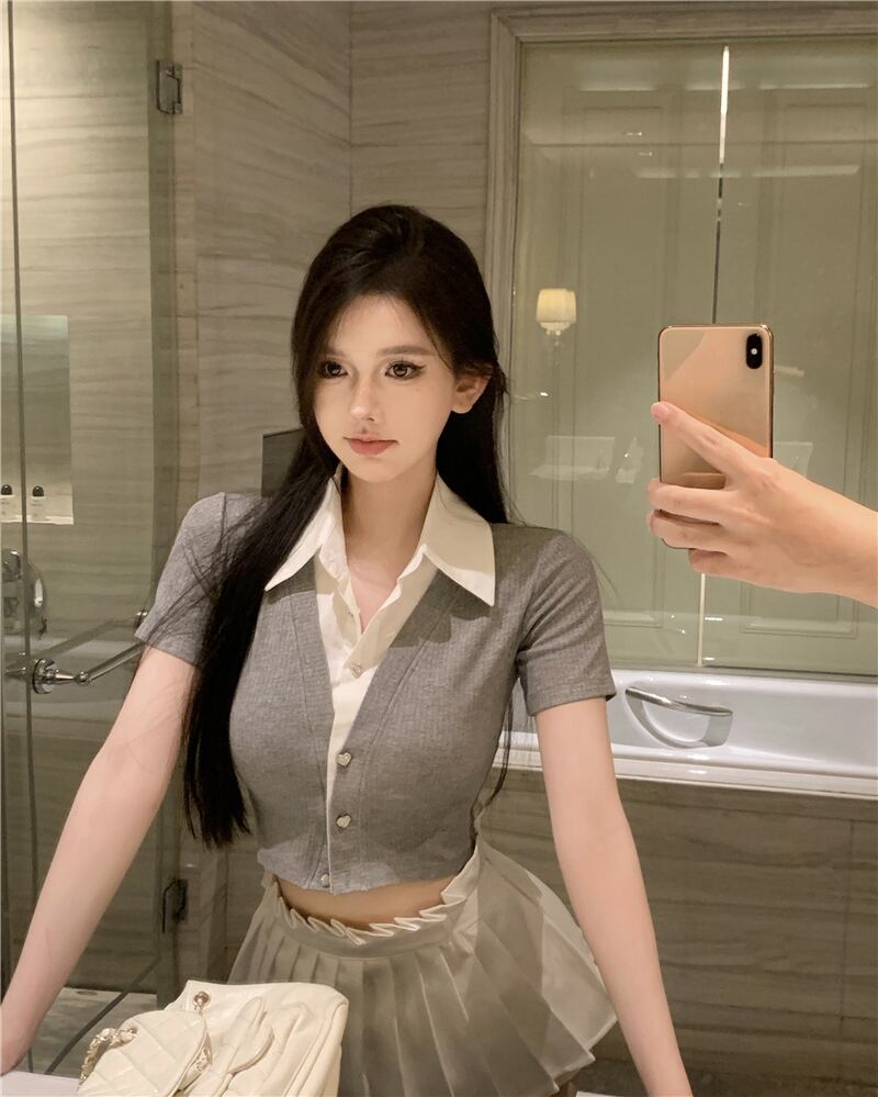 フェイクツーピースポロカラー半袖シャツ女性の夏の純粋な欲望グレーハイウエスト小スリムセクシーなショートトップ ハイウェスト サマー 夏物 ピュア bstraw39633704885 | beaute25