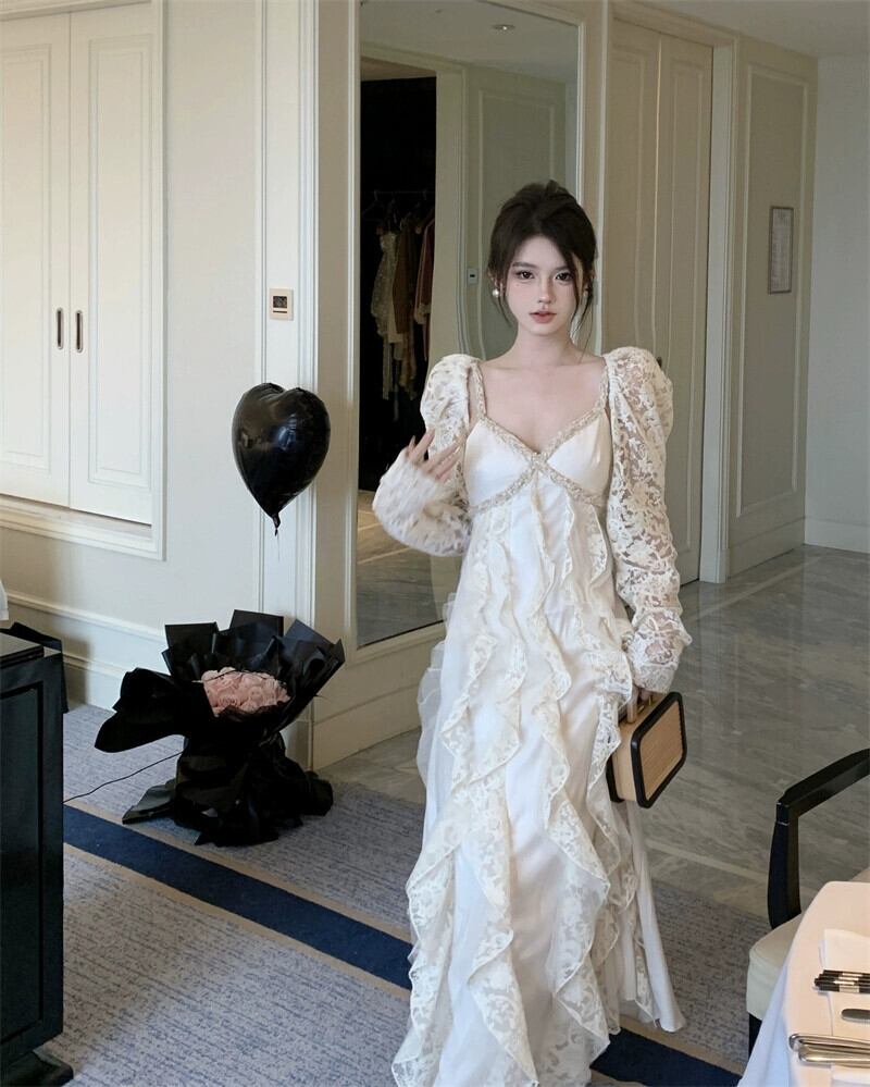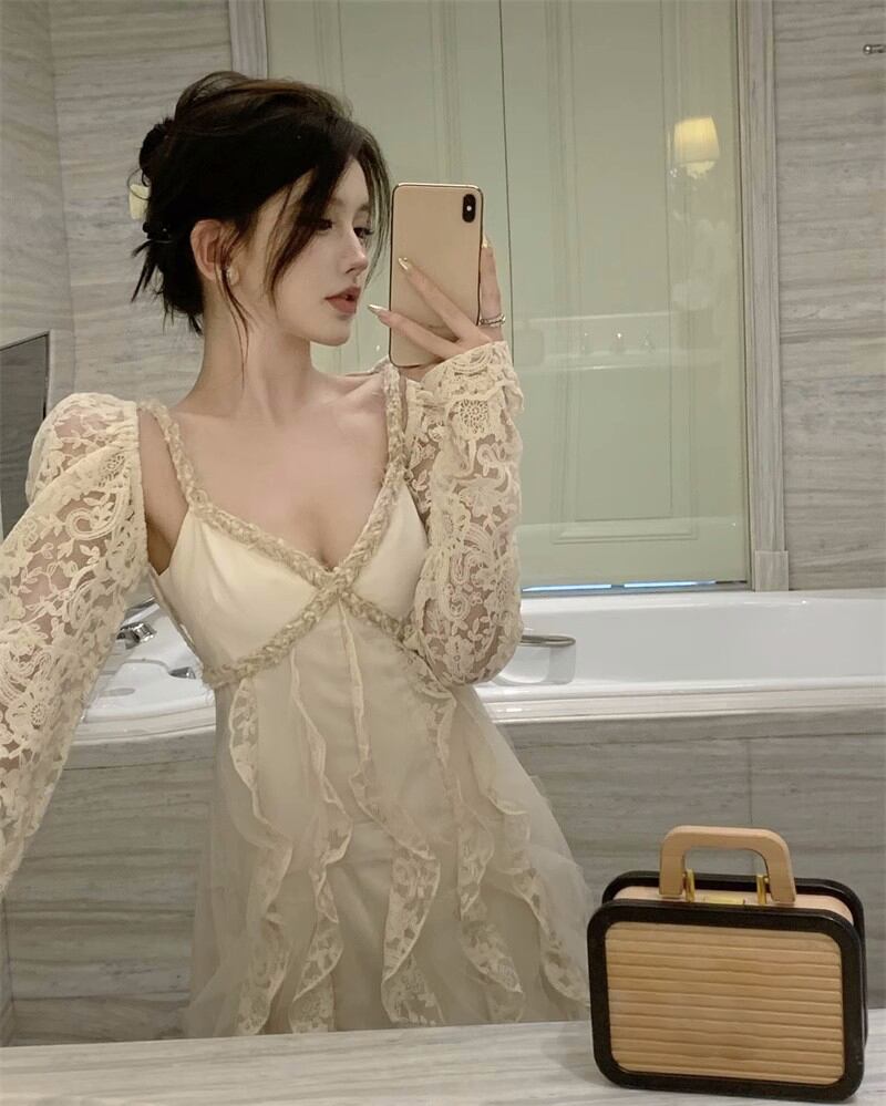 フレンチレースフリルサスペンダードレス女性の夏のミルクスイートスカートvネックスーパー妖精気質ハイエンドドレス 大人ガーリー スウィート キュート カジュアル サマー 夏物 bstraw82918902000 | beaute25